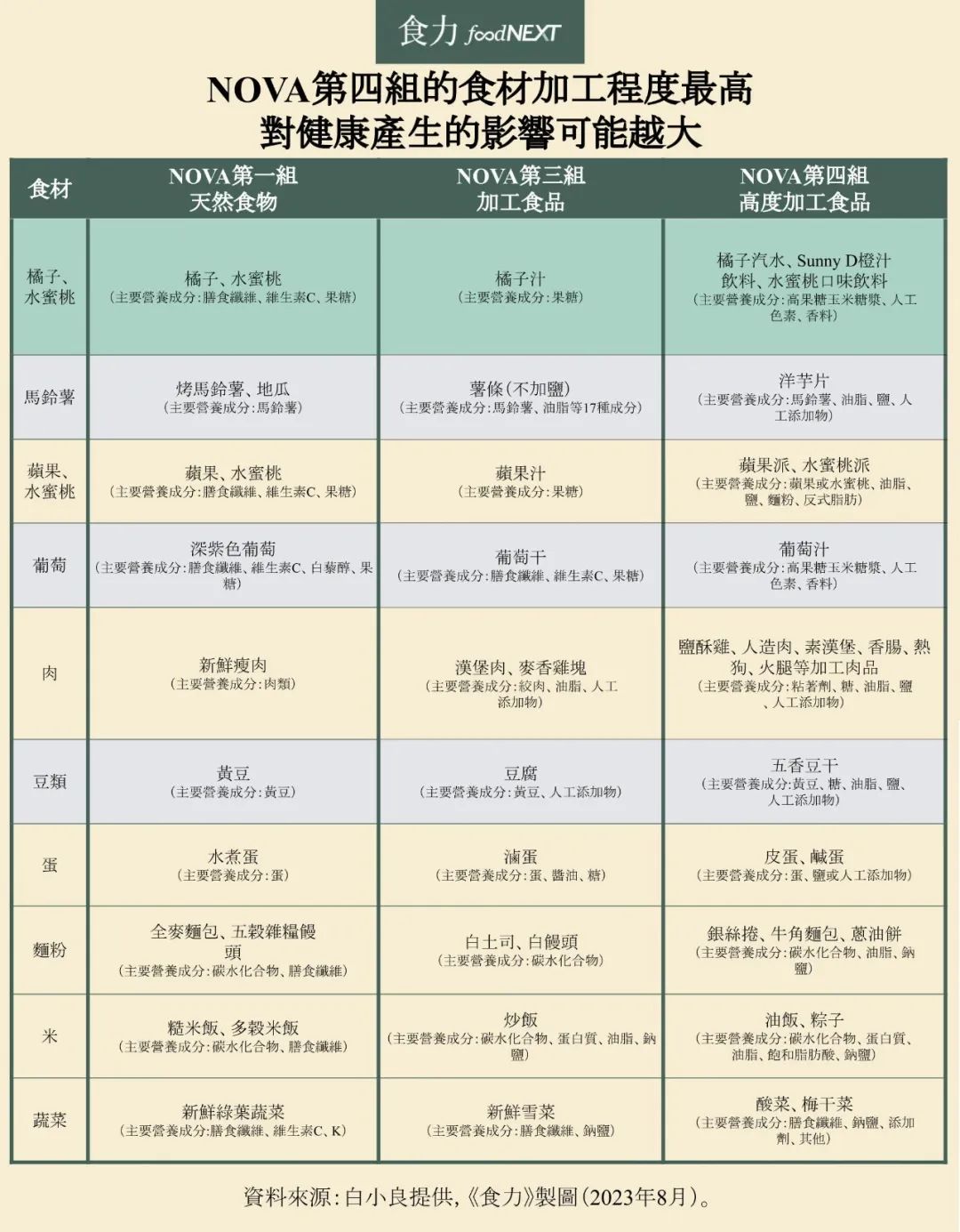 7、将NOVA食物分类法应用在看似同一原料类别,事实上却完全不同或因加工程度而对健康产生负影响的食物或食品。