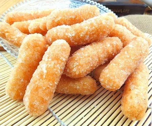 江米条是用糯米面加豆粉和面后在焖锅里蒸出来,放在石臼里用棒子捶,再秆成圆形,晒干用油煎出来,最后蘸梅花﹑松花﹑芝麻等豆沙制作而成的一种食品。多用于后食。