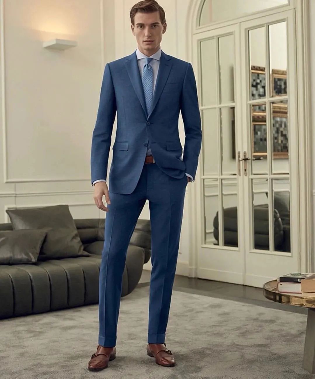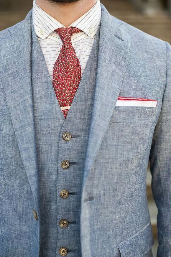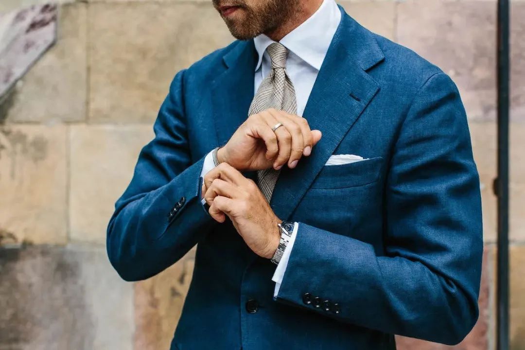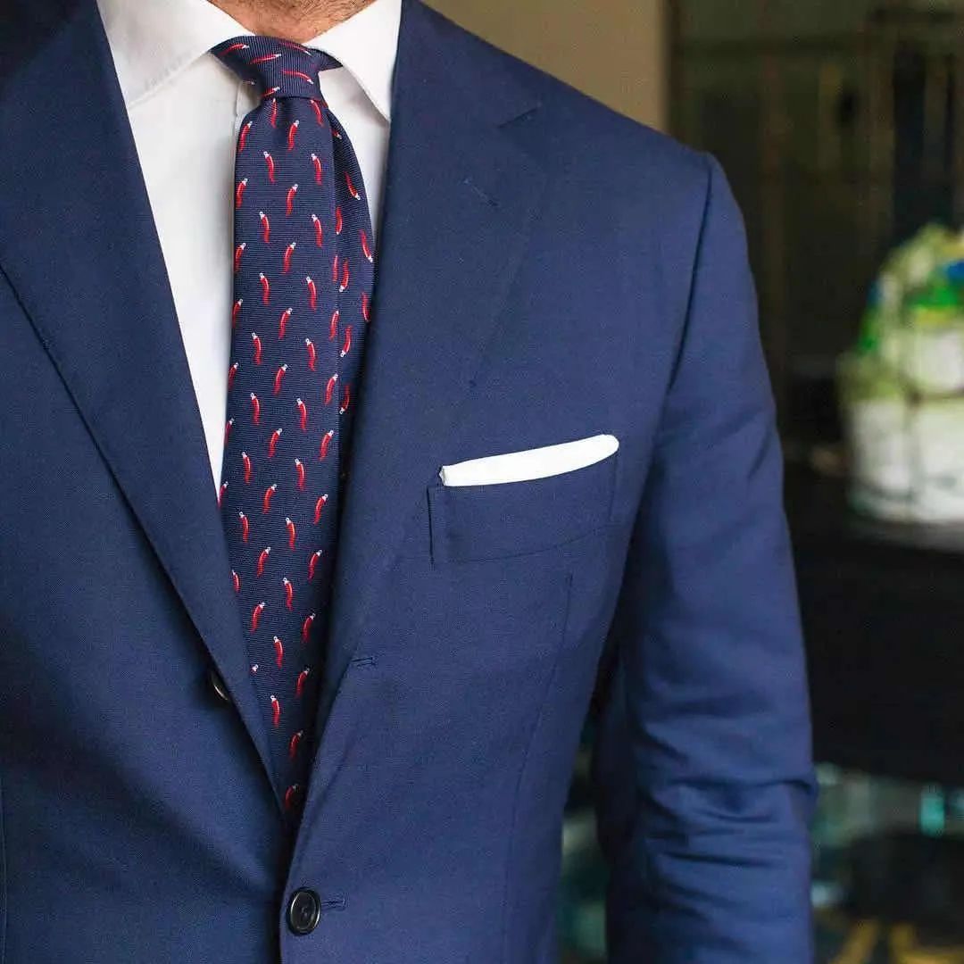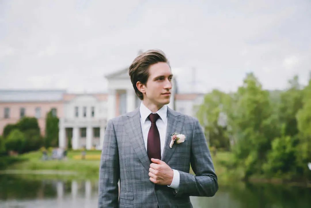 婚礼上,相比于新娘的一身行头,新郎的造型实在是简洁太多了。不过简洁并不意味着随便,除了一眼就能看到的西装、衬衫之外,新郎身上其实还有不少值得推敲的地方哦,而且这些看似不经意的小细节,都能让你的新郎形象加分不少。姑娘们是时候给你的新郎来一套充满亮点的婚礼新郎穿搭了!领带可以算是西装的官方cp了,当然也是新郎造型中必不可缺的部分,一条好的领带不仅能为整体造型加分,还能体现新郎自己的性格和品位。那么如何给千篇一律的西装选择一条独特又不浮夸的领带来输出存在感呢?挑选领带时首先需要考虑的就是它的尺寸问题,市面上常见的领带宽度一般多为8-9cm,适用于各种场合,且不易出错。在视觉上,领带越宽给人的感觉越成熟稳重。所以在婚礼当天小服建议男士们可以选择一款较宽的领带,这样不仅凸显气质又能彰显气场。说完宽度,我们再来聊聊它的长度,一条领带在打结系好后它的标准应该是落在腰带上方,除了可以展现细节品味外还会让身体比例在视觉上更加协调。