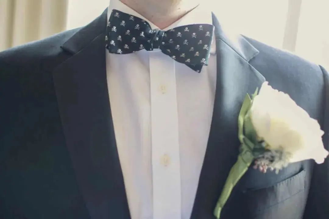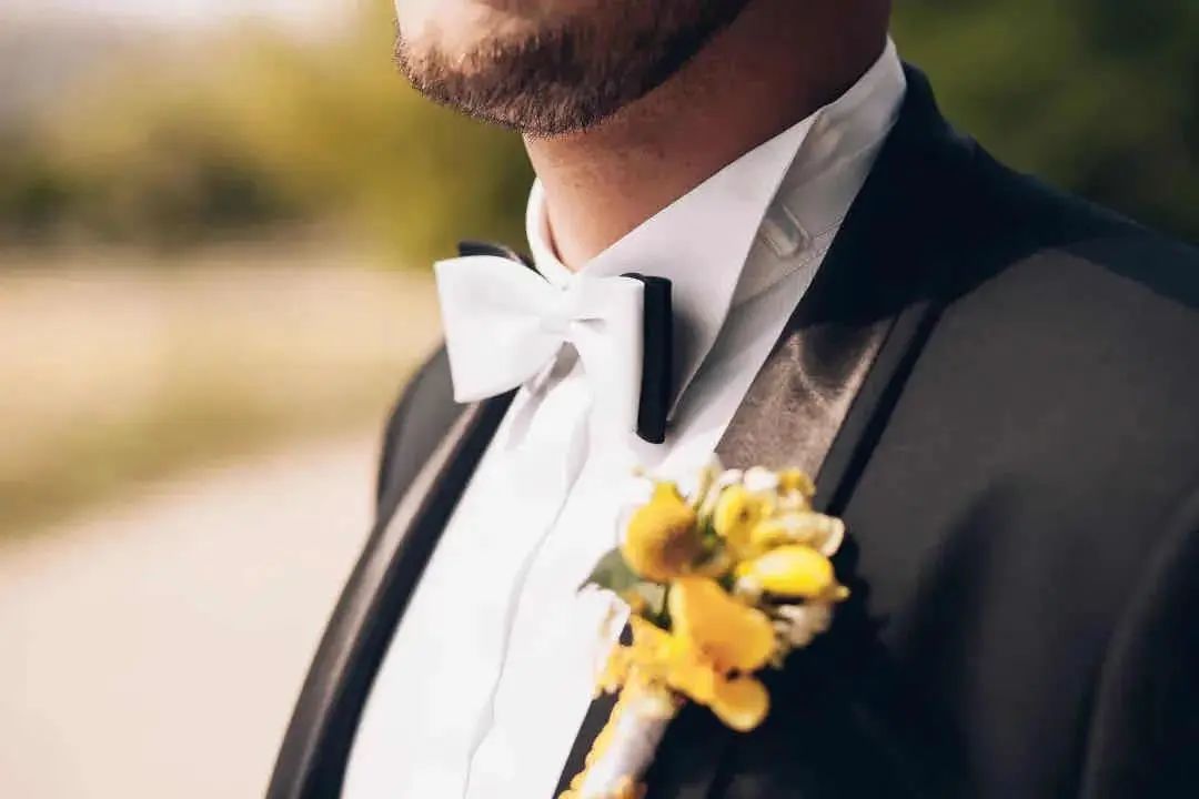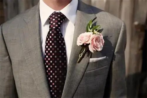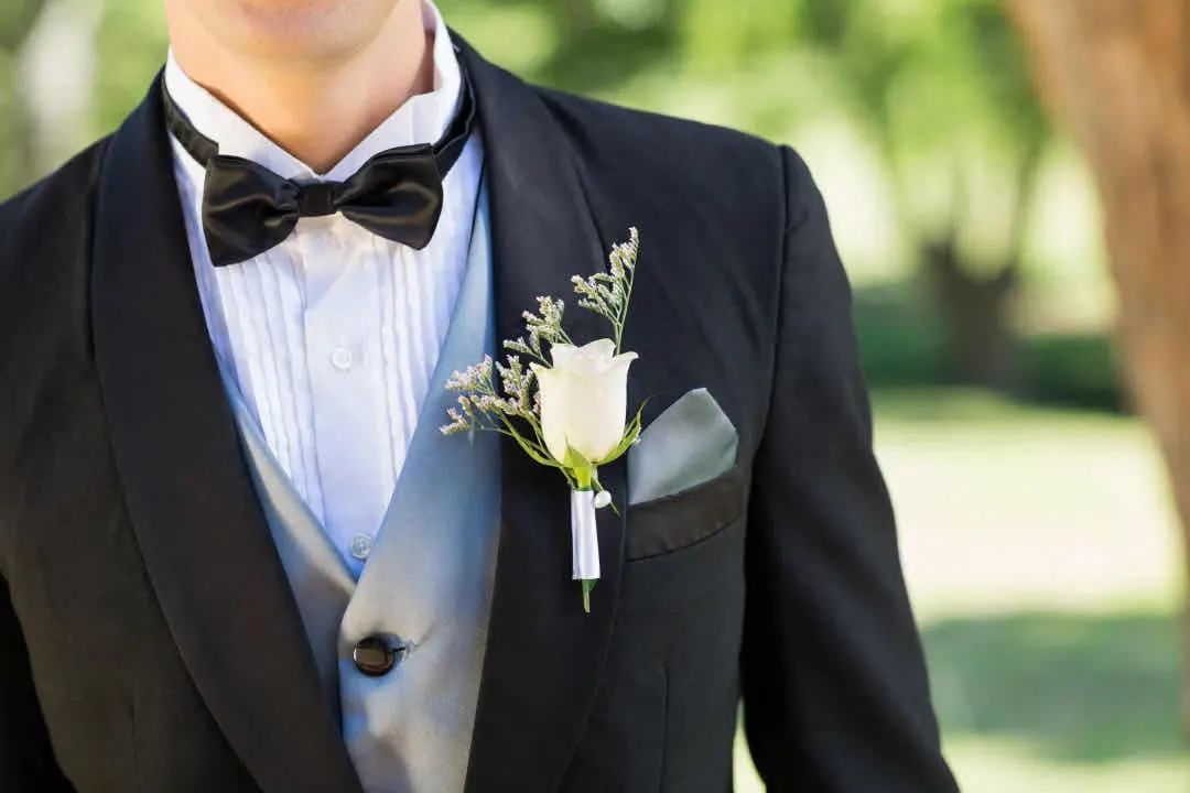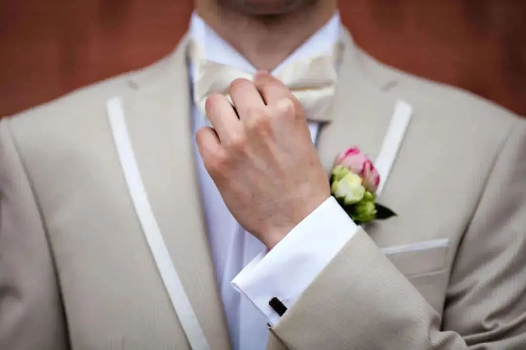 领带的材质选择也很重要!市面上的领带材质主要分为真丝、针织、亚麻、纯棉等,不同材质的领带搭配出的效果也各具特色。对于新郎来说,领带最好是选丝质的,它自带的光泽感与礼服西装组合瞬间营造出高级质感,把新郎的魅力发挥到极致。至于内搭的选择,白衬衫是最简单又不会出错的搭配方法,任何花色的领带都可以轻松驾驭。如果说西装是新郎的华服,那领结就是为其锦上添花的“最佳伴侣”。一直以来领结都是高贵的象征,主要用于正式场合的装饰作用。与领带相比领结的知识和搭配常常会被我们忽视,今天为大家详细地介绍一下领结的“前世今生”。领结起源于17世纪欧洲战争时期的克罗地亚雇佣兵,他们使用丝巾围绕颈部以固定领口,这方法逐渐被法国上流社会所采用。在一次宴会上法国国王路易十四发现一位大臣上朝时脖颈间围了一条白色的围巾,还打上了一个漂亮的结,于是大加赞赏,就这样,领结被赋予了高贵的象征,并开始流行至今。领结的颜色,一般来说,白色、黑色是最百搭的,白色显得更加庄重,能够让新郎很好和伴郎团做区分。藏青、宝蓝等深色系西装+同色系领结或是黑色领结,也是婚礼的保险搭配。领结的款式也有很多种如: 经典结、蝴蝶结、钻石结等。经典结是最经典的领结款式,也是最常见的款式,宽度在5.5-7厘米之间。如果新郎们不知道自己适合哪种款式,选经典结准没错,因为它基本上适用所有场合时配戴。钻石结的形状偏向菱形,形状就像钻石一样精致有型,这种领结可以选择颜色及纹路较花哨的面料来制作,如果你的新郎是喜欢变化,性格活泼的年轻人,那么这款领结会更适合他。对比起领带,领结的出错几率会更少,而且相对于其他的饰品也更为灵动便捷。袖扣可谓是精致男士的必备物件,在穿搭上来说,佩戴袖扣是需要穿着叠袖衬衫,为此你可能还要准备几件不同的衬衫。可能大家会觉得麻烦,但对于很多要求着正装出席的正式场合来说,袖扣则是必备的配件。常见的袖扣多为金属材质,造型简洁的几何袖扣,成熟稳重,搭配性强,这种袖扣对于男士来说是一个最稳妥的选择。还有一种就是镶嵌宝石的袖扣,造型新颖别致,比较适合年轻、活泼的男士。袖扣在颜色的选择上应该与男士身上其他的配饰呼应,但如果实在统一不了色彩,那爱酱建议可以将皮带扣、领带夹与袖扣同色。为了方便,也可以选择大品牌的套装产品,让皮带扣、领带夹、袖扣相互辉映。婚礼上新娘是全场最美丽的焦点,新郎也是最帅气的绿叶,而胸花恰恰就是新郎结婚当天与新娘捧花呼应的最佳点缀。胸花,小服相信很多人都以为把它别在胸前就可以了,其实不然,胸花佩戴也是有要求的。按传统的绅士西服着衣法则,西装的上衣口袋只能放置口袋巾,胸花则须别在西装外套的左领。考究的西装在左领的位置会有个扣眼,就是专门设计来放胸花的。如果没有现成的扣眼,就把胸花别在西装左领之上,花梗垂直向下,对准鞋子的位置即可。新郎在选择胸花时应以简单、小巧为原则,如果想要展现自己的个人品味也可以选择领带上的某种色彩作为主色调,就可以让新郎的整体造型魅力十足。新郎如果更加注重与新娘捧花的搭配,那么就可以选择同一种花材,或是同一色系。如果新郎是喜欢追求个性的话,也可以选择鲜艳且有造型感的胸花,不过需要注意不要抢了新娘的风头哦!婚礼上除了娇艳可人的新娘,新郎同样是主角哦,所以当你为自己选择完美美的婚纱与各种首饰之后,也千万别忘了身边的新郎!不要让他们挠破头都不知道怎么搭配,记得把这篇文章分享给他多学习几遍。