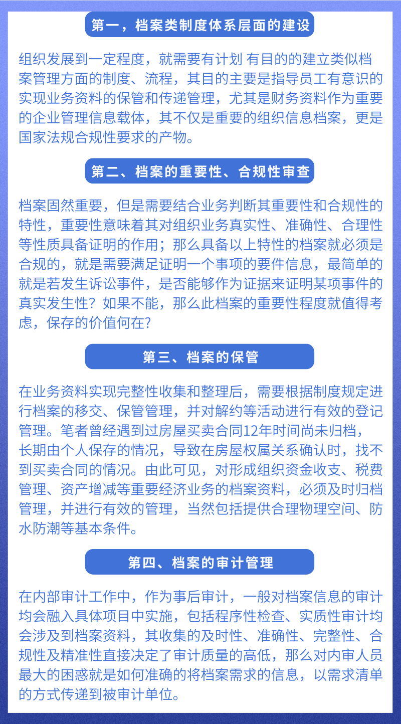 对于一个组织来说,对档案资料的管理必须是一致性要求,每个人都深知各种信息资料的重要性程度,并积极的去维护和践行,这不仅需要不断的档案管理宣贯,同时并与合规性一样,形成一种工作习惯和文化。尤其对于审计人员来说,会通过审计,起到档案管理规范化管理的推动作用。