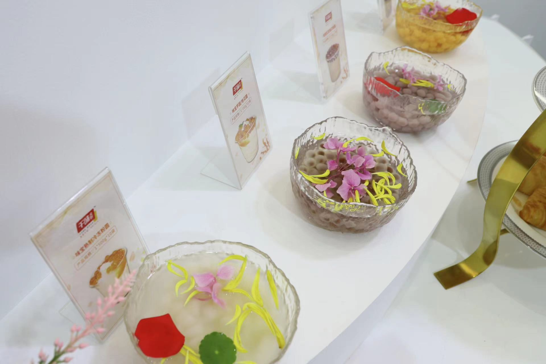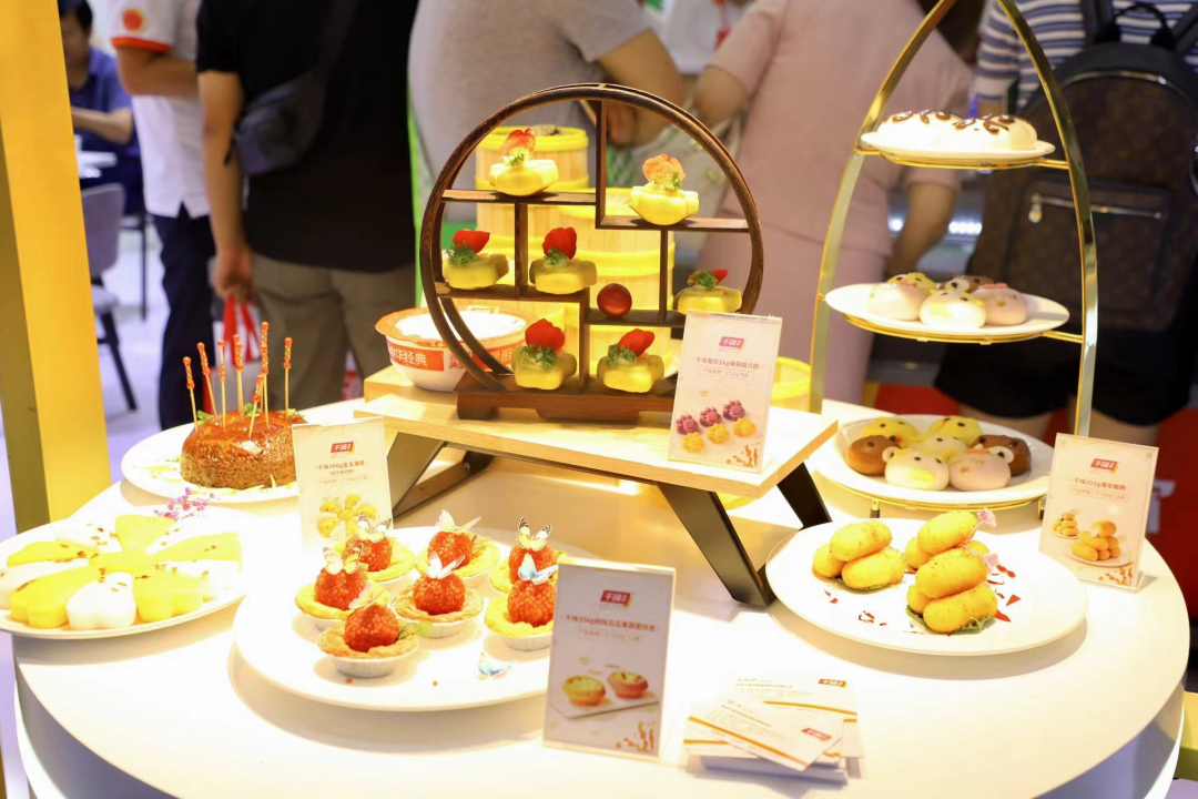不仅在出餐形式上大胆创新,千味央厨更是秉承创新理念,在产品上创新不止。此次展出栩栩如生的水果包新品、颠覆大众对传统春卷认知的玉米皮素三鲜大春卷、以及融合口味的桃桃瓜瓜果蔬蛋挞等产品,展现了强大的创新能力。得场景者得天下。今年,千味央厨在展位设计上重点采用了场景展示方式,重点展示了早餐、宴席、团餐、外卖四大场景。早餐场景,千味央厨多款早餐新品实力来袭,有油条、蒸饺、包子、胡辣汤、芝麻球、卡通包、粗粮糕等多款新品;