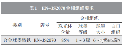 金相组织要求。EN-JS2070金相组织要求见表1。以某铸造厂为例,对EN-JS2070没有金相组织要求时,抗拉强度平均为580 MPa左右,增加金相组织特别是珠光体含量要求后,抗拉强度平均为640 MPa以上。