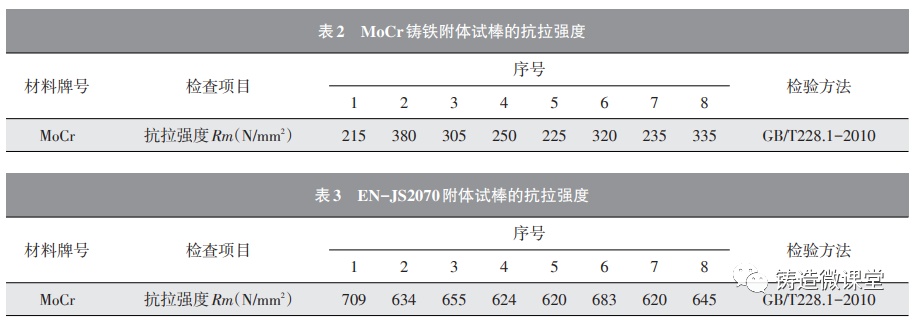 MoCr 铸铁附体试棒的抗拉强度,ENJS2070附体试棒的抗拉强度见图。根据数据可知,国产MoCr铸铁附体试棒的平均抗拉强度为283MPa,EN-JS2070 的平均抗拉强度648 MPa,因此 EN-JS2070性能远高于MoCr铸铁。