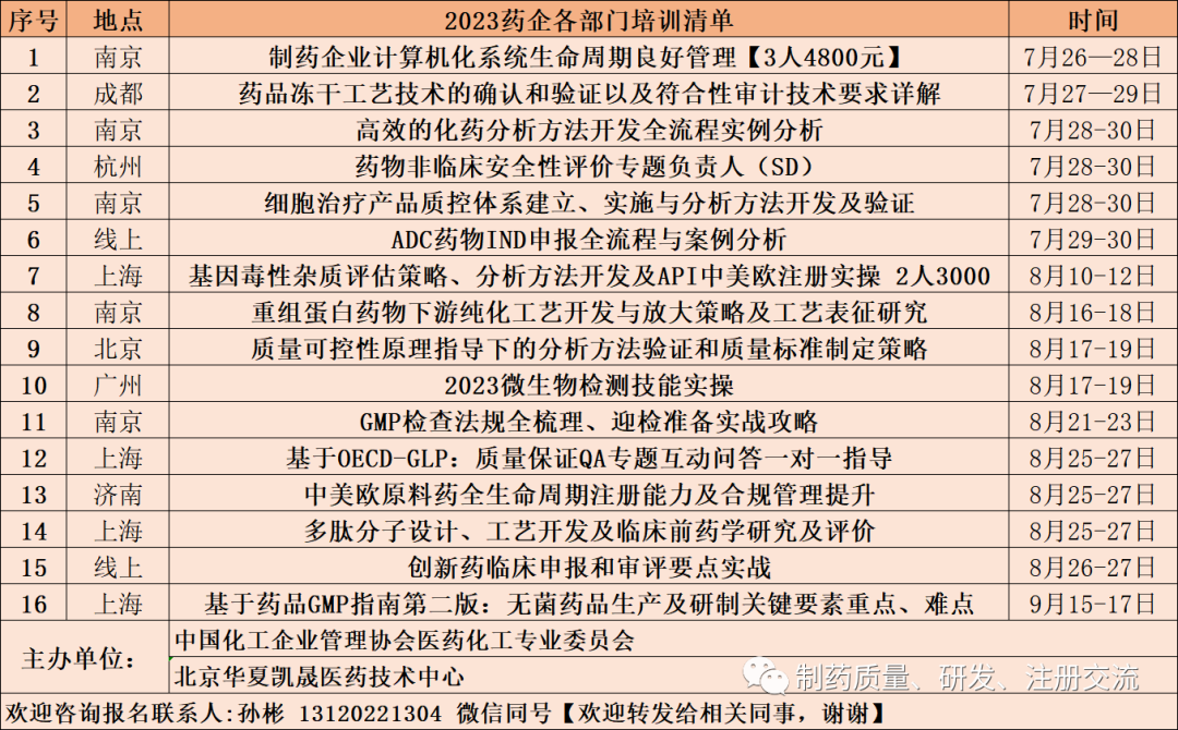 南市8月25-27日-2023中美欧原料药全生命周期注册能力及合规管理提升专题培训班北京8月17-19日-2023质量可控性原理指导下的分析方法验证和质量标准制定策略专题培训班上海市8月10-12日2023基因毒性杂质评估策略、分析方法开发及API中美欧注册实操专题培训班