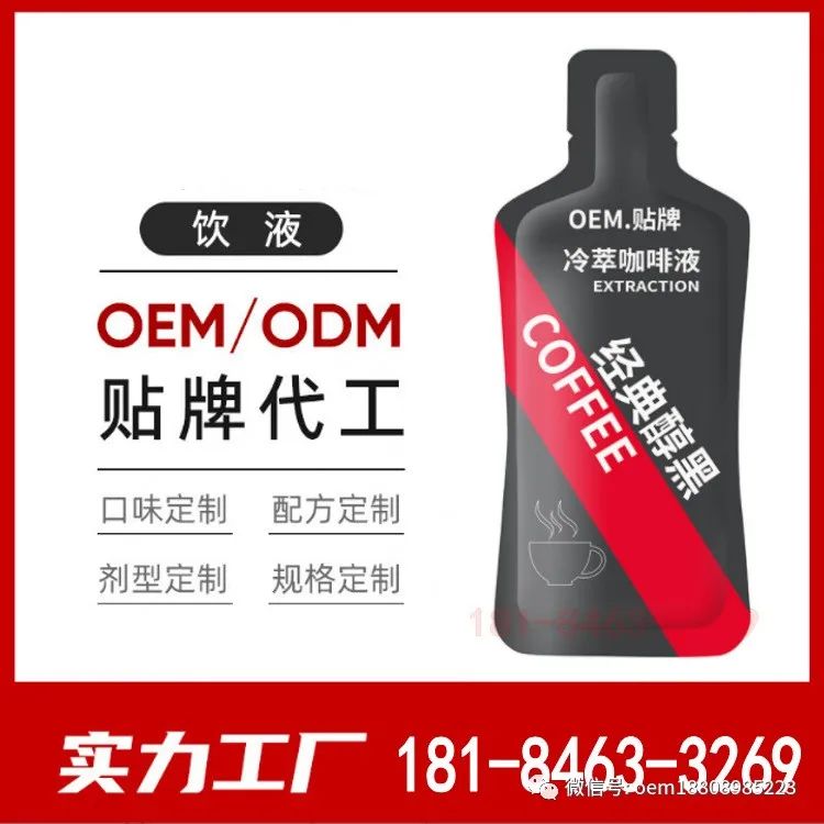 袋装冷萃咖啡液OEM定制加工,人参枸杞原浆营养饮品贴牌,透明质酸钠玻尿酸饮品加工,烟酰胺胶原蛋白肽口服液OEM,GABA氨基丁酸茶氨酸饮品加工,厂家可按客户需求订做不同配方产品,专业提供策划、设计、包材、配方、生产、送货一站式OEM贴牌定制服务。
