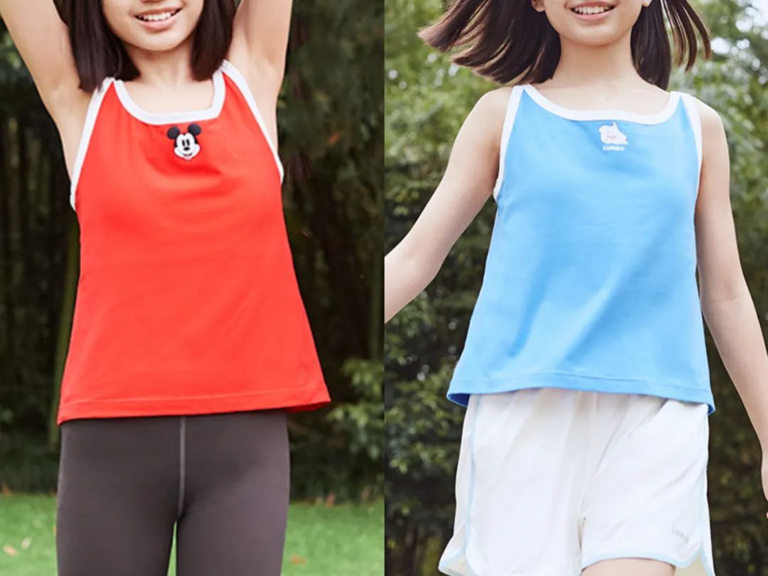 迪士尼小背心有红、蓝两个颜色,胸部上方还有迪士尼卡通图案。