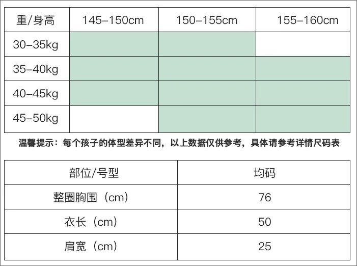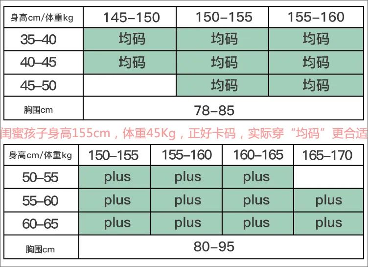 号码分“均码”和“plus”,我觉得160cm以下普通身材的孩子选均码就行,150cm以上的小胖闺女可以选plus。