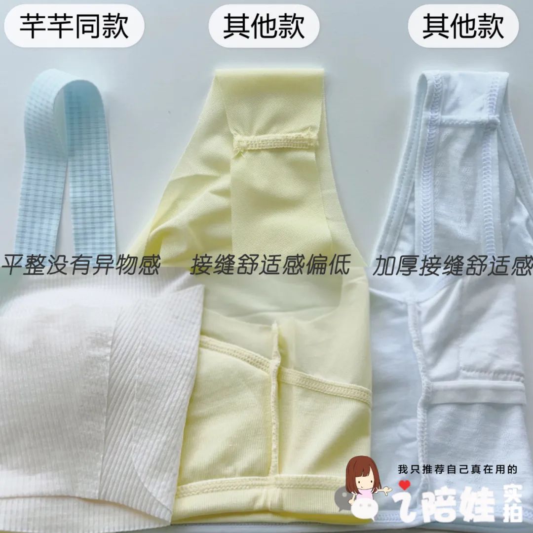 关于卷边:这次likeuu我推荐的两款内衣长度不同,因为非常薄,像闺蜜孩子有小胖肚子,穿“工字背”中长款时,动作大了会有点卷边,但是孩子倒没说不舒服或硌得慌。我更建议小胖闺女选宽肩带基础款哈~