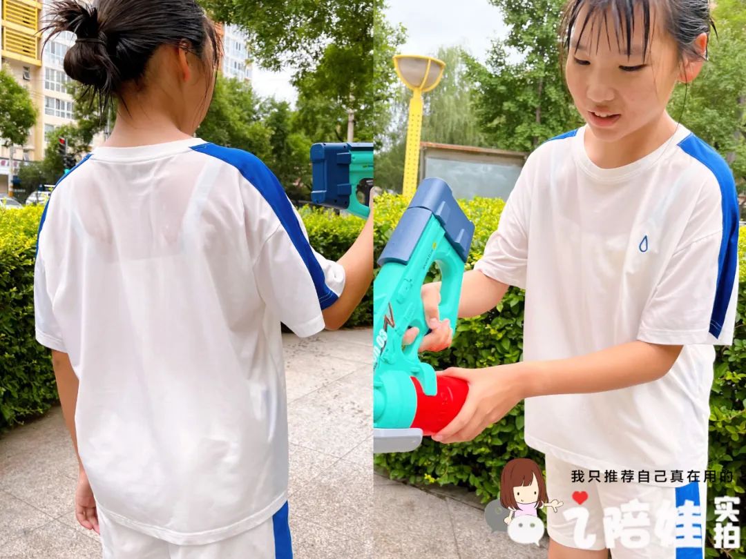 像闺蜜孩子穿的白色T,挺容易透内衣的,但是这次玩水全身都湿了,也不太看得出内衣痕迹。