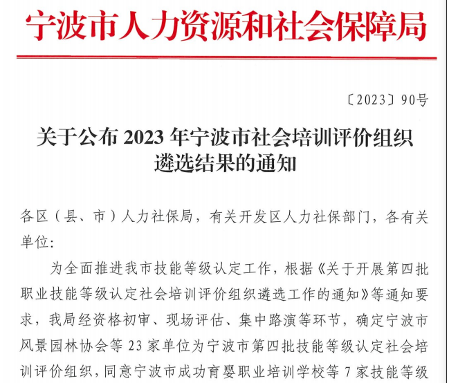 近日,在宁波市人社局职业技能鉴定中心指导下,经网上申报、专家实地评审、遴选路演和公示等程序,宁波市风景园林协会获评为宁波市职业技能等级认定社会评价组织单位,获准开展园林绿化工(花卉园艺工)(3级、4级、5级)、草坪园艺师(3级、4级、5级)的职业技能等级认定工作。