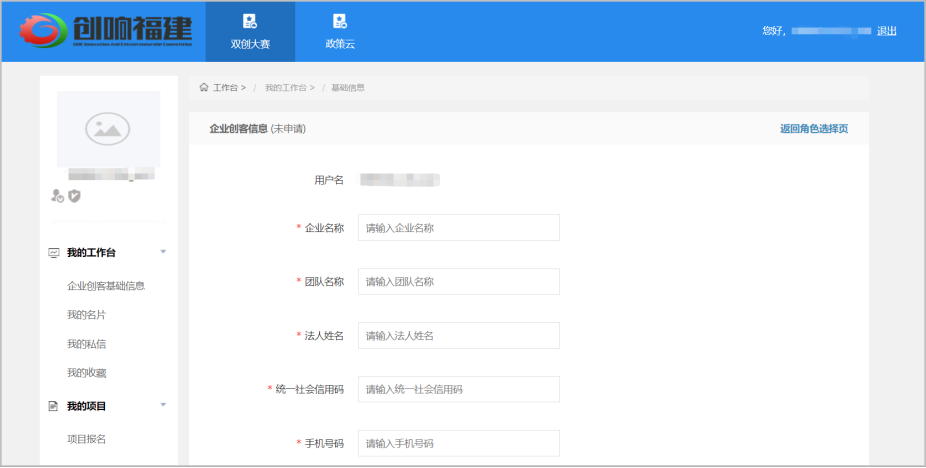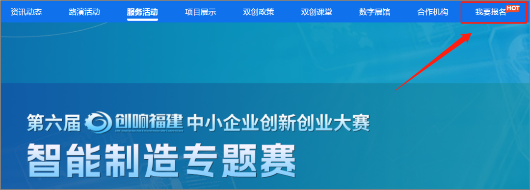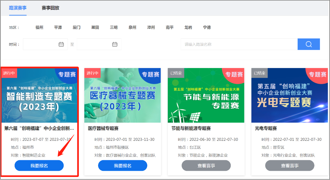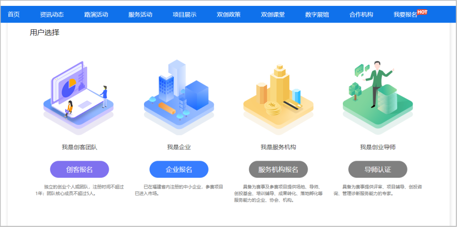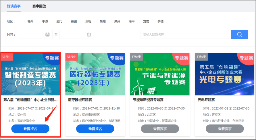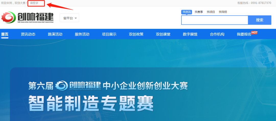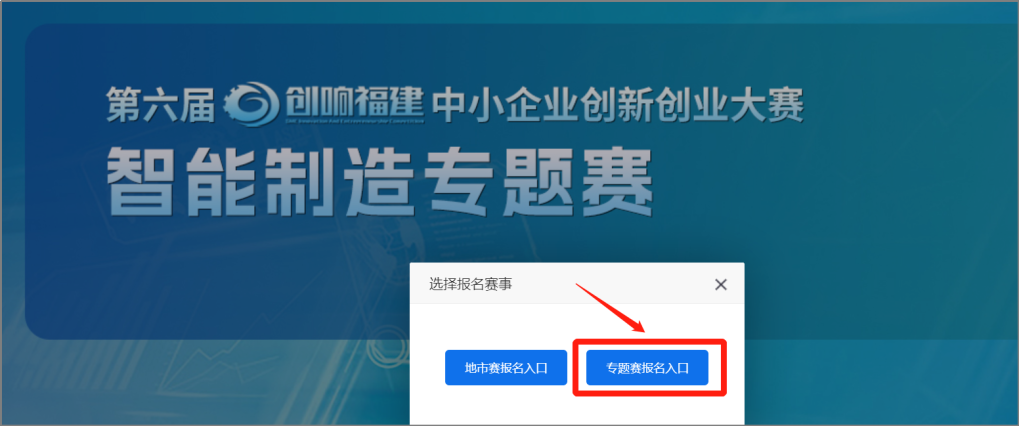 注:平台注册和登录功能由“福建省社会用户实名认证和授权平台”提供统一支持,账号注册、登录问题,请咨询0591-62623959。在账号已登录状态,在平台首页选择【我要报名】,选择【专题赛报名入口】。