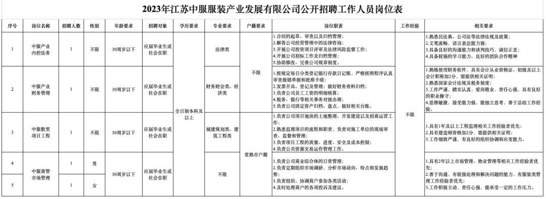 7.具备《2023年江苏中服服装产业发展有限公司公开招聘工作人员岗位表》中报考岗位要求的其他资格条件。
