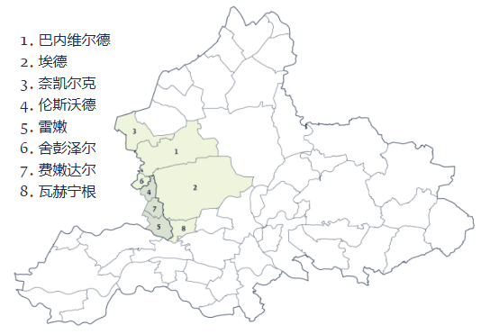 荷兰食品谷以荷兰1.7%的土地撬动了荷兰农业与食品约三分之一的出口额。食品谷是由瓦赫宁根市、埃德市等8个市镇组成的区域(如图1所示),该区域面积约700平方公里,总人口约34万,年产值约650亿美元,年出口额约325亿美元。