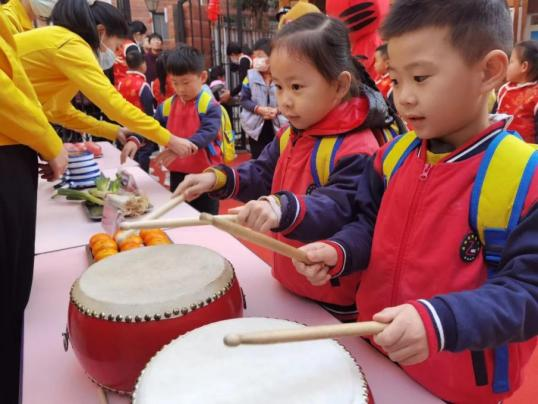 三击鼓。一击目明耳聪,二击茅塞顿开,三击学业有成。击鼓明志,志向远大,信心坚定。
