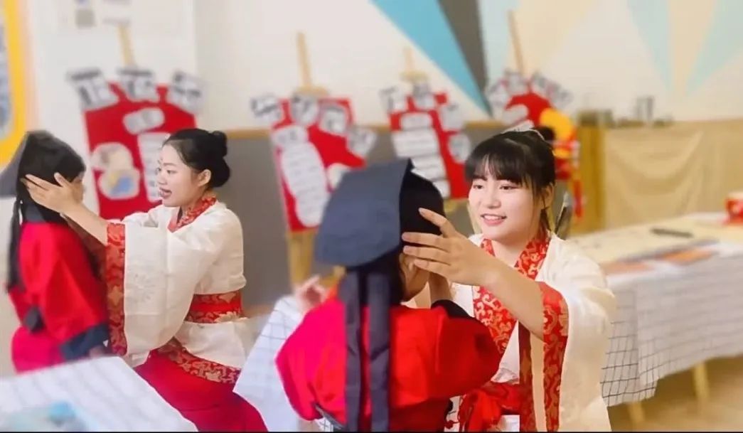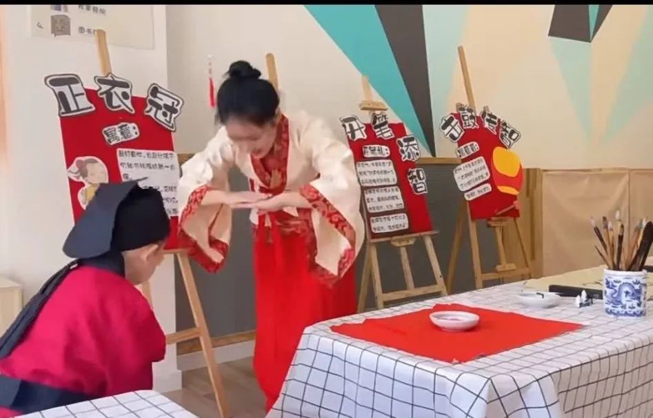 幼儿依次排队走到净手台前洗净双手,以示对师者、长辈的敬重。先净手,后静心,盼望幼童能静下心来学习学问。正衣冠,展风貌。童蒙之学,始于衣冠;先正衣冠,后明事理。