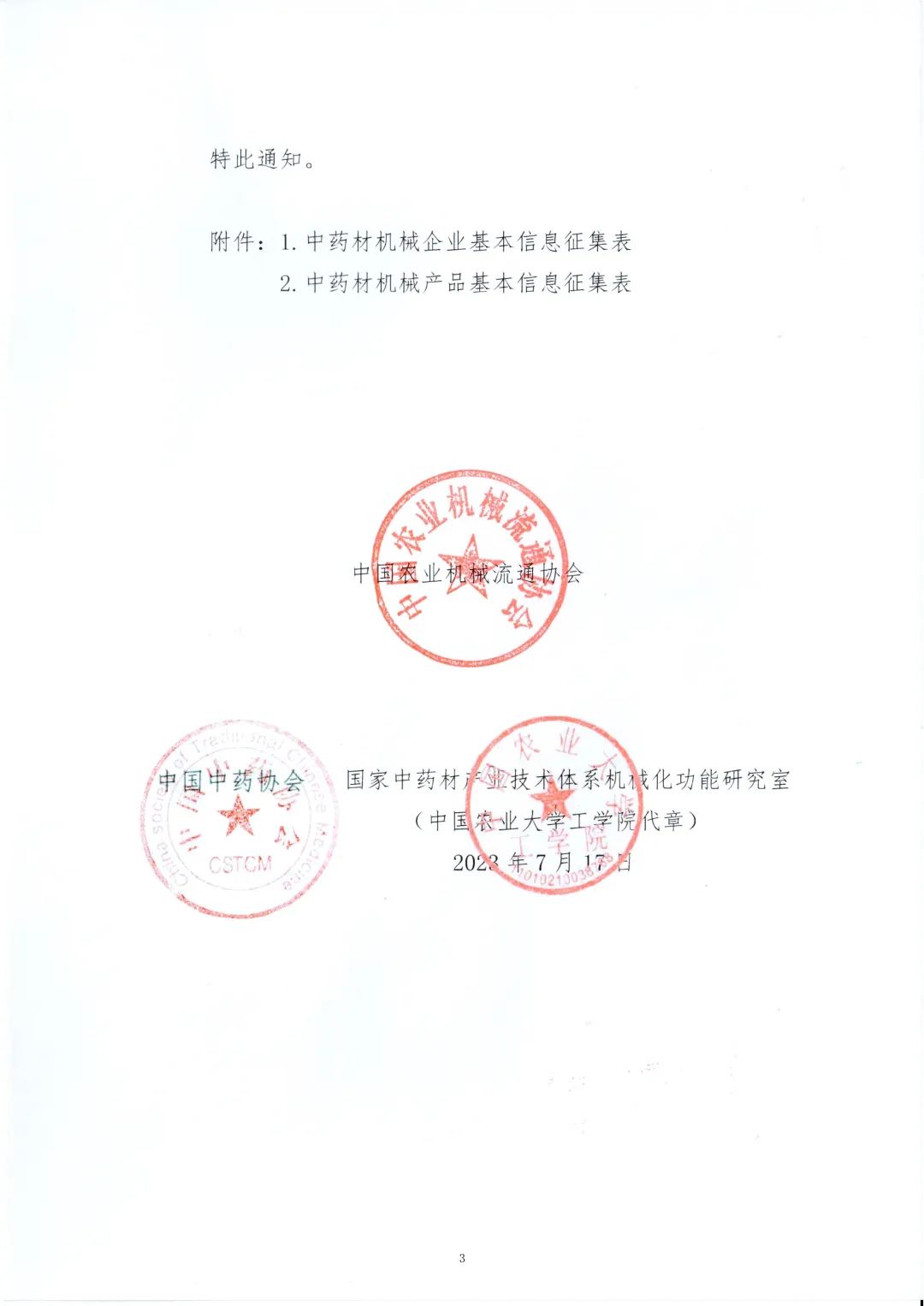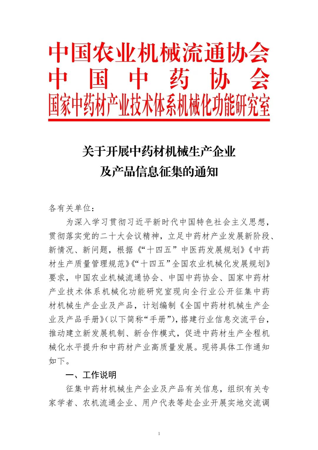 为深入学习贯彻习近平新时代中国特色社会主义思想,贯彻落实党的二十大会议精神,立足中药材产业发展新阶段、新情况、新问题,根据《“十四五”中医药发展规划》、《中药材生产质量管理规范》及《 “十四五”全国农业机械化发展规划》要求,中国农业机械流通协会、中国中药协会中药材种植养殖委员会、国家中药材产业技术体机械化功能研究室现向全行业公开征集中药材机械生产企业及产品,计划编制《全国中药材机械生产企业及产品手册》,搭建行业信息交流平台,推动建立新发展机制、新合作模式,促进中药材生产全程机械化水平提升和中药材产业高质量发展。