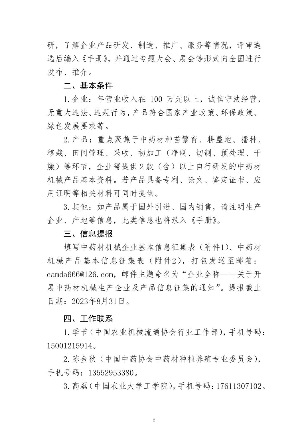 凡符合要求的企业均可提报信息,产品重点聚焦于中药材种苗繁育、耕整地、播种、移栽、田间管理、采收、初加工(净制、切制、预处理、干燥)等环节。请将征集表等信息发送至邮箱:camda666@126.com,提报截止日期为2023年8月31日。
