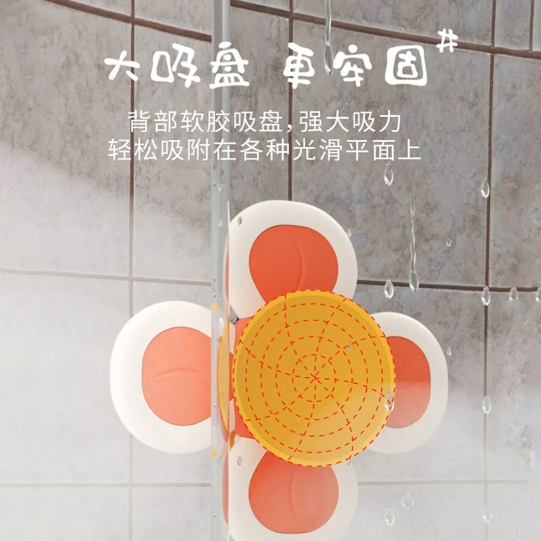 将转转乐吸附在浴盘或者瓷砖等合适的地方,然后宝宝自己就会主动入水去玩耍转转乐,这不仅能锻炼宝宝的抓握能力,还能达到吸引宝宝注意力,安抚宝宝焦躁情绪的目的。