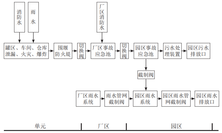 图1 单元—厂区—园区/区域3级水环境风险防控系统示意图