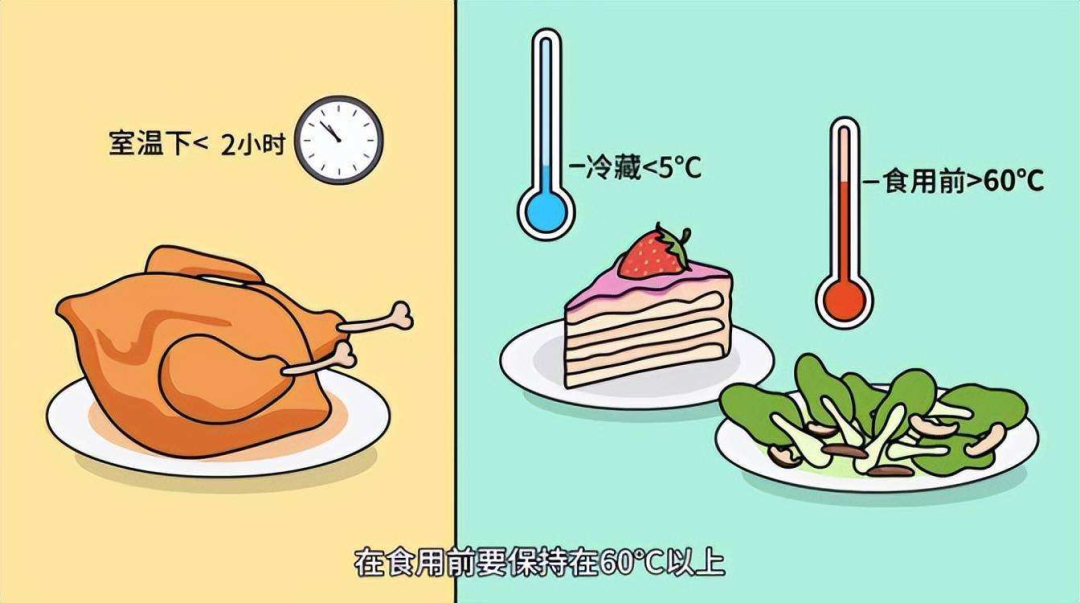 集体食堂、餐厅、家庭等供应的热食室温下存放不应超过2小时,同时确保食物中心温度不低于70℃。此时期高温天气易导致食物加速腐烂变质,建议少量多次制备食品,即做即食,尽量不吃剩菜剩饭。