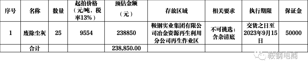 鞍钢实业集团有限公司冶金资源再生利用分公司定于2023年08月17日在德邻循环平台(网址:http://xh.dllg56.com)进行废除尘灰一项危险废物的网络竞价销售,现将具体事项公告如下:1、报名时间:公告日-2023年08月16日15:00截止。2、看货时间:2023年08月16日。竞买人如需看货,请于公告日- 2023年08月15日17:00(工作日8:00-17:00,节假日和双休日除外)与鞍钢实业集团有限公司冶金资源再生利用分公司联系预约看货,竞买人自愿到实物现场查看实物情况,并办理相关签字和拍照等事宜。3、竞价时间:2023年08月17日13:30-14:30。1、参与竞价客户条件:本次竞价面向鞍钢电商平台注册的客户,新客户可通过电商平台自行注册,不明事项请联系平台客服,客服电话:400-9855-888(2)提供环境评价、排污许可证、固废管理制度及管理台账等材料,由产权单位按《中华人民共和国体废物污染环境防治法》(2020.08.31)的相关要求组织评审。(3)提供利用处置危险废物相关设施的工艺流程、技术水平和实际运营情况;处置信息及时反馈情况及利用产物的实际出路情况。(4)提供近3年内相关危险废物道路运输协议、运输单位道路运输经营许可证(经营范围含销售的危险废物项目)、危废运输事故应急预案等相关材料。材料提交途径:扫描原件将电子版发至企业电子邮箱delinzhilian@163.com(注明公司名称及参加项目),材料提交截止时间:2023年08月16日15:00。材料由德邻智联负责收集,并提交由委托方组织审核。(1)本次出售的废旧物资系危险废物,不具备跨省转移条件,因此只对辽宁省内企业出售。(2)本次出售面向具有依法设立并正常经营有效存续的企业,企业营业状态正常。(3)本次出售的废旧物资数量均为预估数量,最终结算以实际数量为准,不扣杂。(4)本次出售的废旧物资,不可分解、挑选,出售方不做质量保证,不受品名限制,不保证其完整性,不处理质量异议,均以看货现场实物为准。(5)购买人应认真执行国家、地方及行业的相关法律法规,且与鞍钢集团有限公司所属各单位无法律纠纷。(6)对本次出售的废旧物资品质以看货现场实物为准。购买人可在看货截止日期前进行现场实物检测,所需费用由购买人自理。因废油在销售期间陆续产生,物权单位不做质量保证,不保证其完整性,不处理质量异议。(7)竞买人看货与提货时现场全程禁止吸烟,进入现场必须穿戴劳动保护用品和佩戴安全帽,并且按照生产现场要求做好相关措施。(8)竞买人如需看货取样,需提前与委托方联系看货事宜,否则视为已对标的物情况全部明确,一旦参与网上竞价即视为已现场查验确认标的物。(9)竞价成交的买受人除缴纳全额货款外,还要另外缴纳履约保证金,额度为全额货款的10%,若保证金不足1万元,需按1万元缴纳。(10)如因股份公司、众元产业公司或其他产权单位生产经营需要,需将本次出售的废旧物资自行利用或政策调整时,则双方本次签订的买卖合同无条件终止。(11)本次出售的废旧物资应以保产为主,如因买受人原因影响生产,除终止合同外,视情况予以5000-10000元罚款,并将客户列入黑名单。(12)本次出售的废旧物资,买受人承担装卸、运输等过程中发生的费用,出售方不提供任何形式的责任担保。运输过程中应采取防散落、防丢失、防渗漏或者其他防治污染环境的措施,不得擅自倾倒、堆放、丢弃、散落固体废物。如出现影响厂容卫生、交通安全等问题,依据相关管理规定对买受人予以惩罚.(13)合同有效期内必须执行完成,否则,视同违约。(14)买受人必须按合同规定时间和要求及时提货,如无特殊情况,节假日及双休日不提货。(15)结算方式:通过存款转账方式支付,不收取承兑汇票。(16)竞价成交后,买方须在五个工作日内向出售方公司账户缴纳全额货款及履约保证金并签订买卖合同,否则,将视为恶意扰乱竞拍秩序,没收竞价保证金并取消购买人一年内参加本公司公开竞价资格。(17)买卖双方如发生合同纠纷,协商不成,任一方均有权向本合同签订地人民法院起诉。(18)竞买人应于竞拍前仔细阅读竞买须知,如有疑问请在竞拍前与委托方取得联系并确认。否则视为完全理解并完全同意本竞买须知所有事项,并承担由此产生的对竞买人的不利后果。4、保证金:为保证竞价秩序,参与竞价客户需在竞价前向电商平台缴纳竞价保证金。本次收取竞价保证金50000元,交款时间至2023年08月16日15:00时截止,否则不允许参加竞价。竞价未成功客户的保证金自动释放,在5个工作日内给予退款;竞价成功客户按照成交总金额的0.8%服务费率缴纳交易服务费用,交易服务费用从竞价保证金中扣除;若保证金不足,客户需补交服务费差额。竞价成功客户可凭其与委托单位签订的合同和退款函向电商平台办理保证金余额的退款手续。5、销售价格为含税价格(含13%增值税)。买受人以银行存款转账方式支付,不收取承兑汇票。6、本批次资源为有底价连续竞价,竞价者在底价基础上进行增价竞价(提醒:在电子商务平台竞价时输入价格为竞价增价,不包含底价,竞价梯度视货值另定),竞价规定时间内最高价格客户竞价成功。此次竞价为延时竞价,延时竞价时间从常规竞价结束前3分钟内最后一次报价开始,单次延时时间为3分钟,以此循环类推,以最后截止时间的最高价结束竞价。7、合同履约:竞价成功客户请务必于接到通知起5个工作日内与鞍钢实业集团有限公司冶金资源再生利用分公司