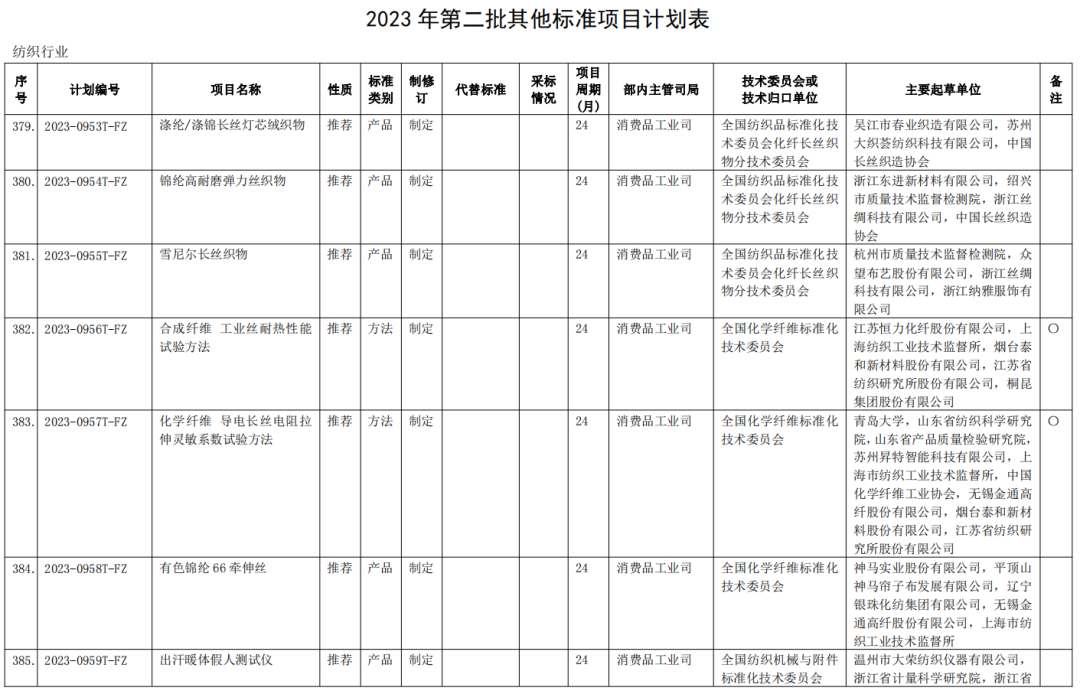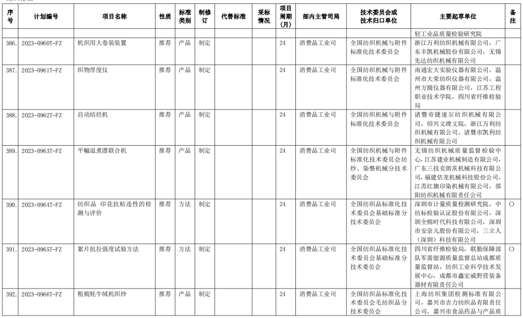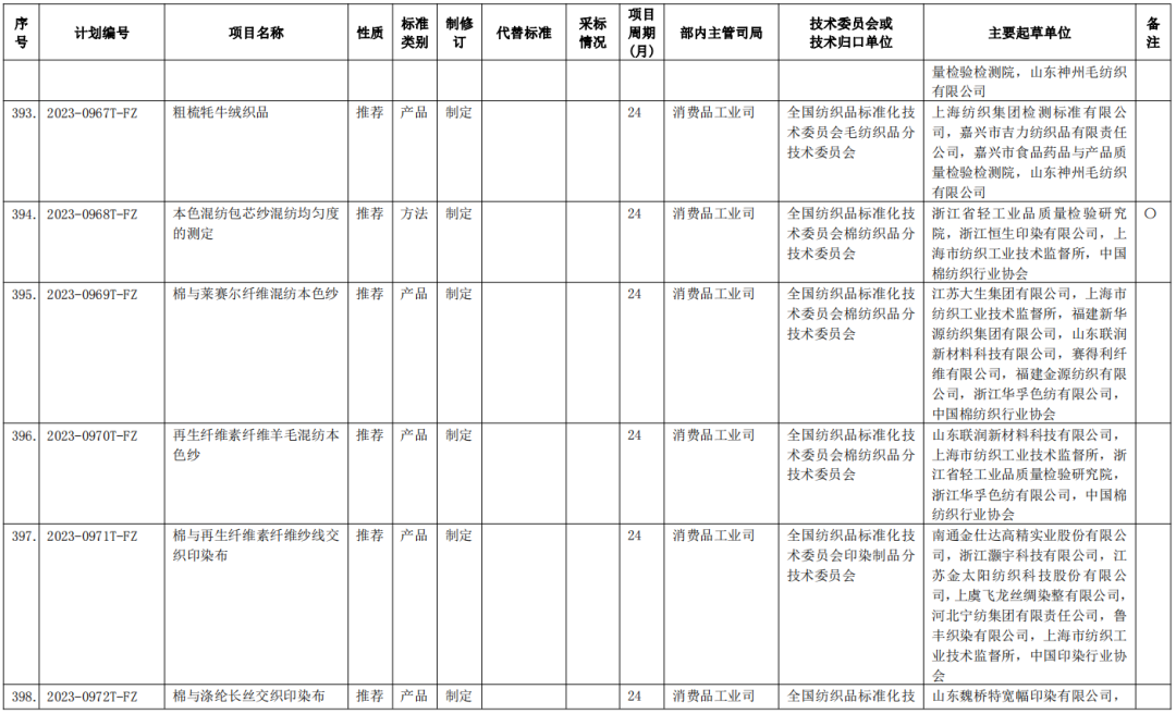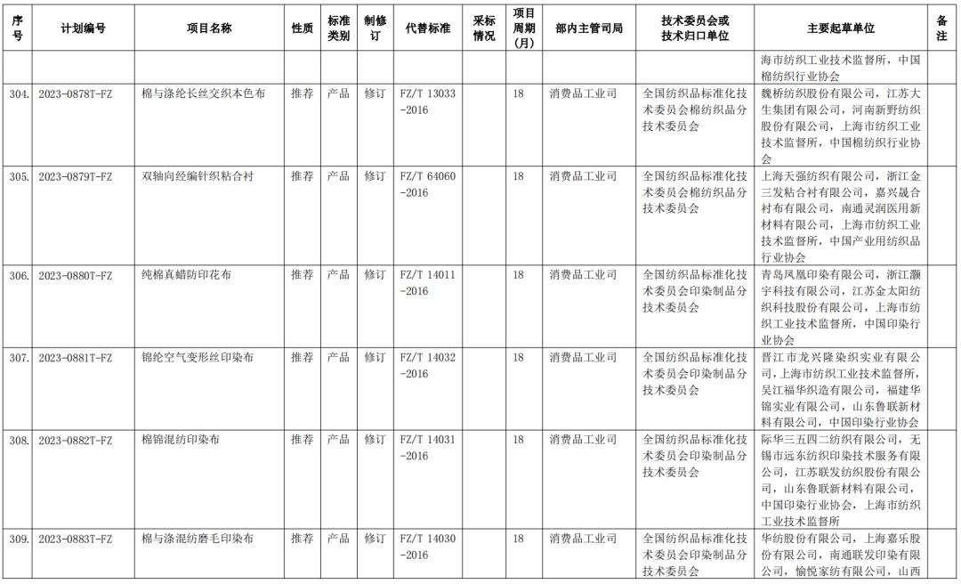 8月4日,《工业和信息化部办公厅关于印发2023年第二批行业标准制修订和外文版项目计划的通知》(工信厅科〔2023〕42号)正式印发第二批行业标制修订计划。2023 年第二批共安排行业标准制修订项目计划 447 项。其中制定 275 项,修订 172 项;重点和基础通用标准 199 项,其它标准 248 项。行业标准外文版项目计划 18 项,其中翻译标准 14 项,同步制定 4 项。纺织行业共85个行业标准计划项目立项。其中,产业优化升级-质量与可靠性提升标准项目50项,产业优化升级-绿色低碳标准项目6项,其他标准项目29项。标准项目清单见下表。一、标准起草单位要注意做好标准制定与技术创新、试验验证、知识产权处置、产业化推进、应用推广的统筹协调。二、有关行业协会(联合会)、标准化技术组织、标准化专业机构等主管单位要尽早安排,将文件及时转发至主要起草单位,并做好标准组织起草、征求意见和技术审查等工作,把好技术审查关。三、部机关相关司局、相关地方行业主管部门要做好行业标准制修订、外文版研制过程的管理工作,确保标准的质量和水平。四、计划执行过程中,如需对标准项目进行调整,按有关规定办理。(点击图片可放大查看)