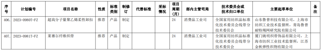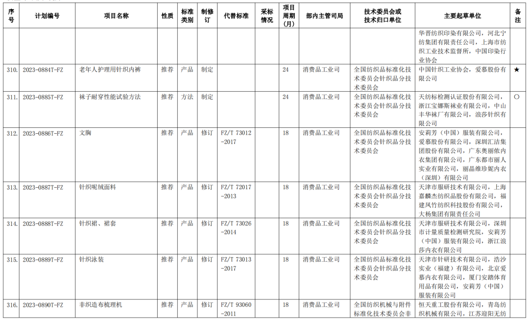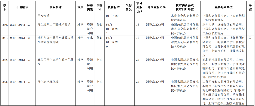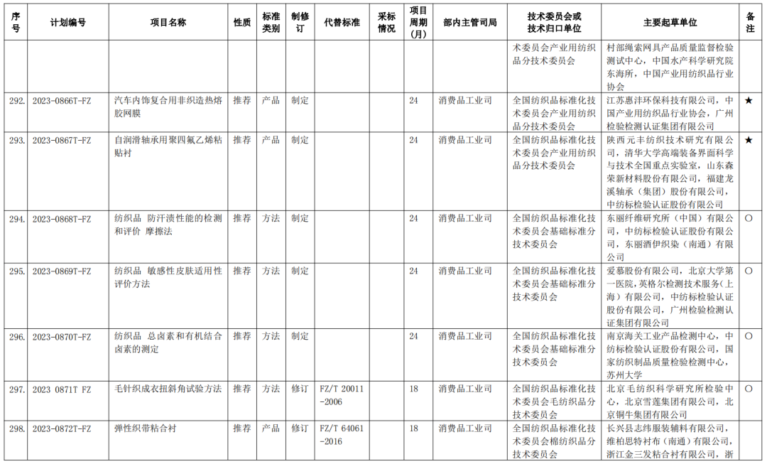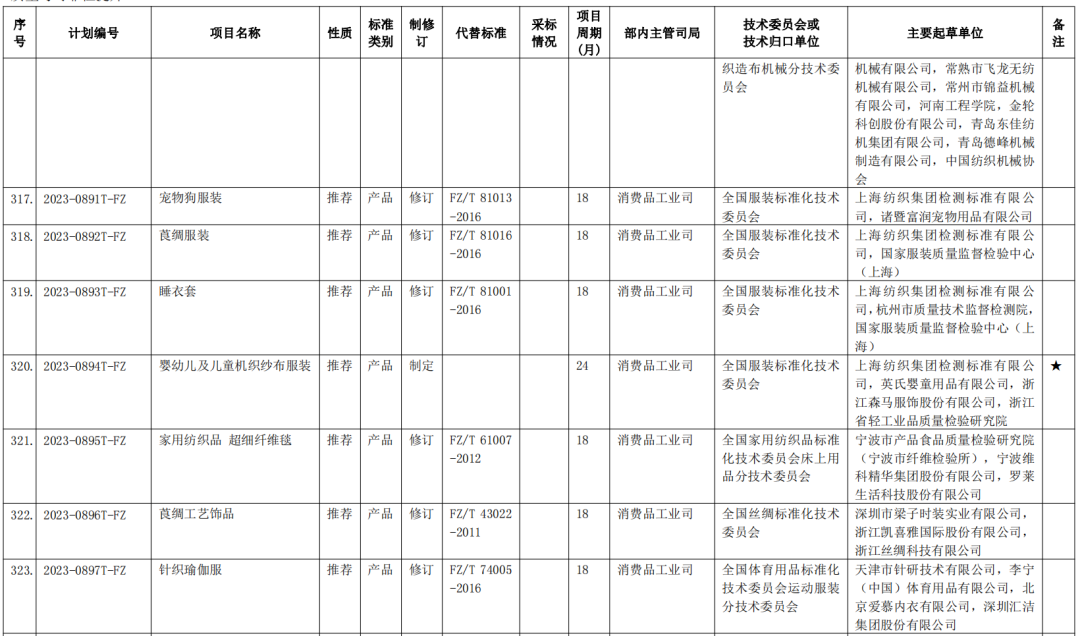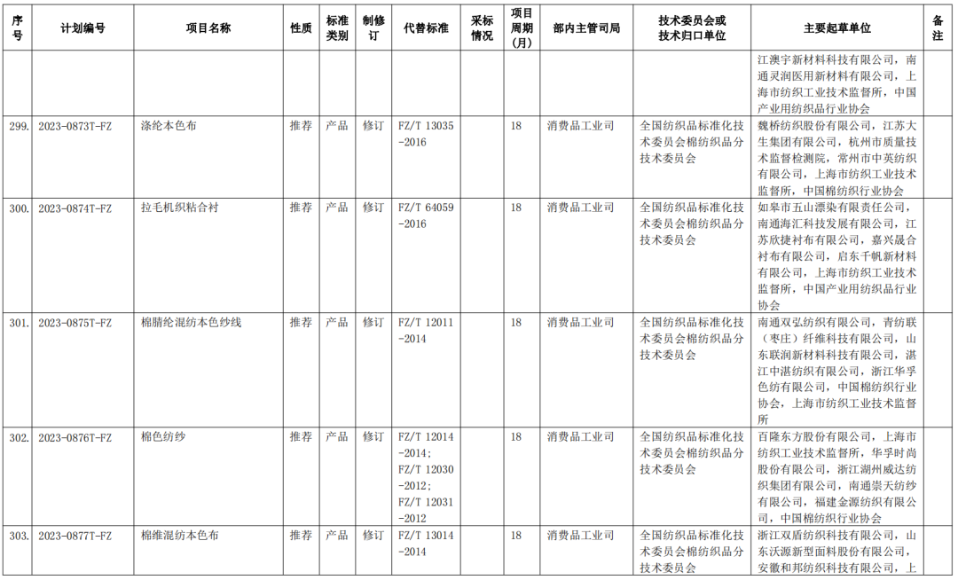 8月4日,《工业和信息化部办公厅关于印发2023年第二批行业标准制修订和外文版项目计划的通知》(工信厅科〔2023〕42号)正式印发第二批行业标制修订计划。2023 年第二批共安排行业标准制修订项目计划 447 项。其中制定 275 项,修订 172 项;重点和基础通用标准 199 项,其它标准 248 项。行业标准外文版项目计划 18 项,其中翻译标准 14 项,同步制定 4 项。纺织行业共85个行业标准计划项目立项。其中,产业优化升级-质量与可靠性提升标准项目50项,产业优化升级-绿色低碳标准项目6项,其他标准项目29项。标准项目清单见下表。一、标准起草单位要注意做好标准制定与技术创新、试验验证、知识产权处置、产业化推进、应用推广的统筹协调。二、有关行业协会(联合会)、标准化技术组织、标准化专业机构等主管单位要尽早安排,将文件及时转发至主要起草单位,并做好标准组织起草、征求意见和技术审查等工作,把好技术审查关。三、部机关相关司局、相关地方行业主管部门要做好行业标准制修订、外文版研制过程的管理工作,确保标准的质量和水平。四、计划执行过程中,如需对标准项目进行调整,按有关规定办理。(点击图片可放大查看)