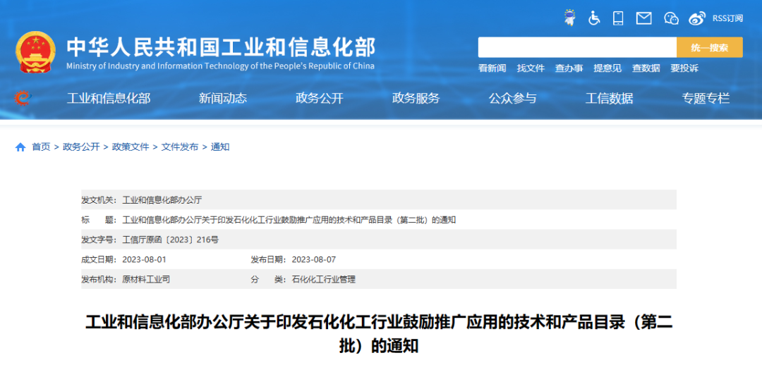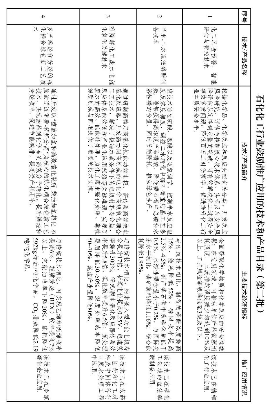 为落实《关于“十四五”推动石化化工行业高质量发展的指导意见》,推动石化化工行业高端化、智能化、绿色化发展,经地方及相关单位推荐、专家评审和对外公示,现将《石化化工行业鼓励推广应用的技术和产品目录(第二批)》予以印发。请各地工业和信息化主管部门加大宣传推广和政策支持力度,推动石化化工行业转型升级。