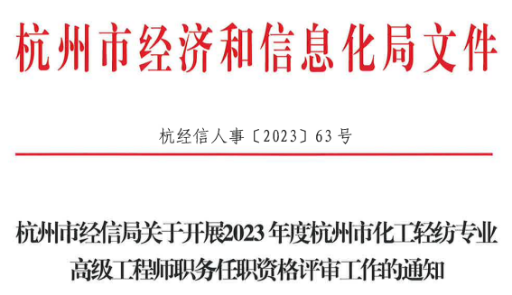 根据浙江省人力资源和社会保障厅《关于做好 2023 年度高级职称评审工作的通知》 (浙人社函 [2023]43号)及我省职称评审相关文件精神,现就 2023 年度杭州市化工轻纺专业高级工程师职务任职资格评审工作通知如下。