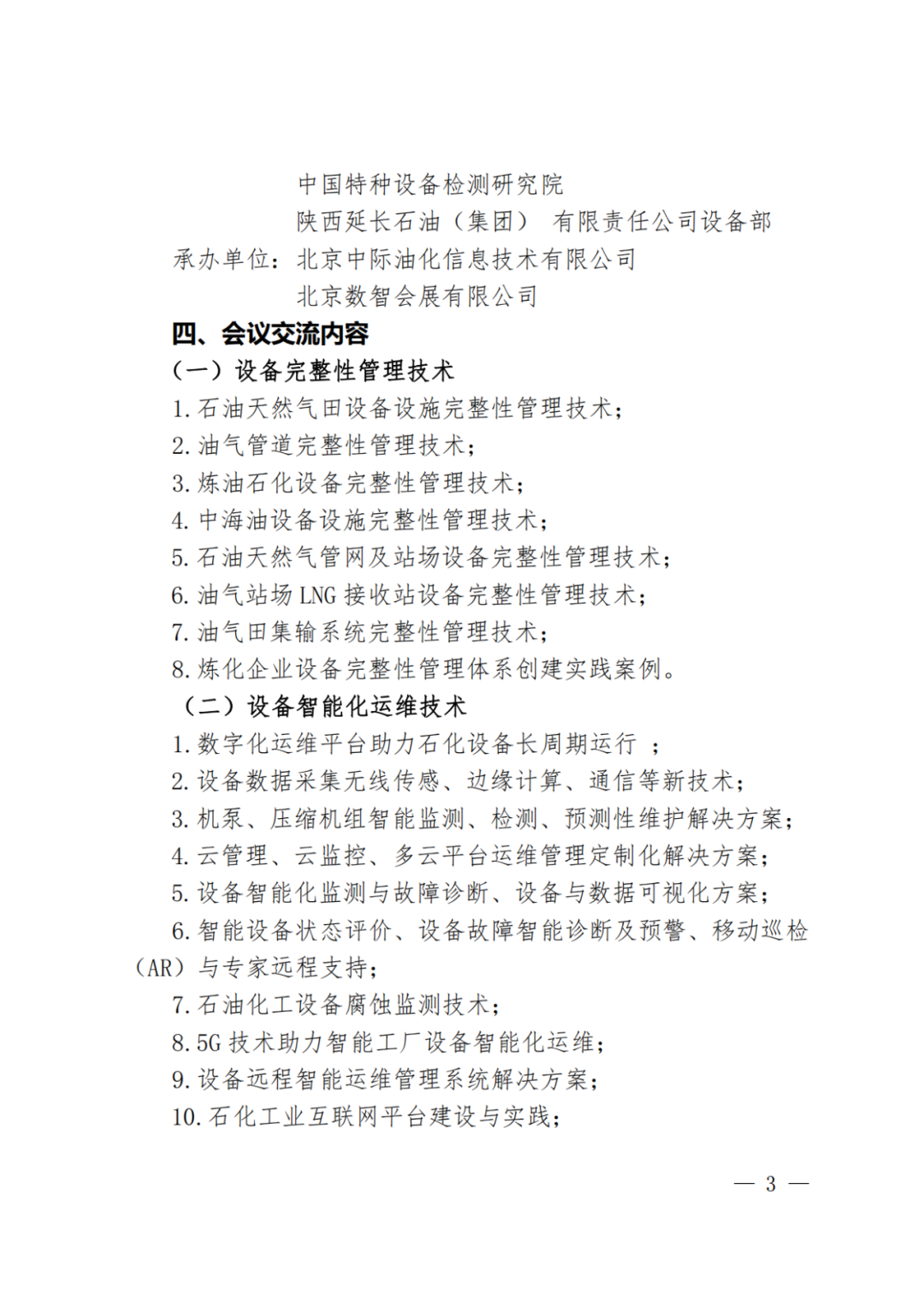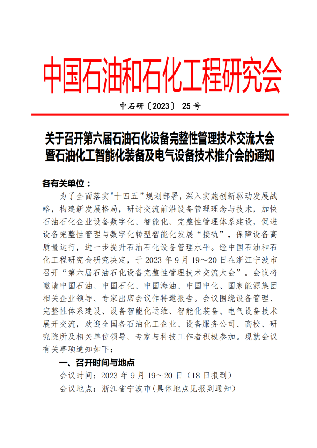 【会议宣传】关于召开第六届石油石化设备完整性管理技术交流大会暨石油化工智能化装备及电气设备技术推介会的通知