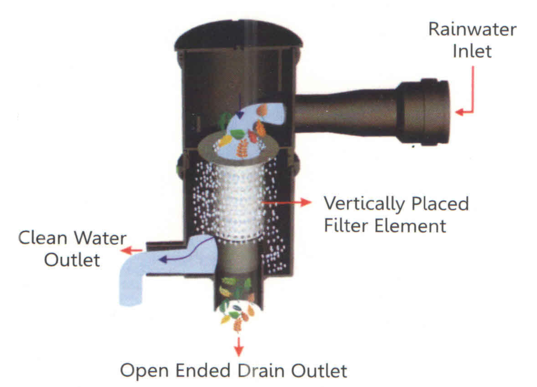 因为楼顶的汇集的雨水,一定会有很多东西,比如作物的叶子、昆虫的尸体等等,首先要过滤。这些大的废物不能经过商用过滤器,会频繁堵塞,好在市售有先进可靠的雨水收集的过滤器,也可以自制。他的道理非常简单,让雨水在设备里形成漩涡,边缘的孔透过干净的水,至于杂物,则在重力作用下自动掉落。