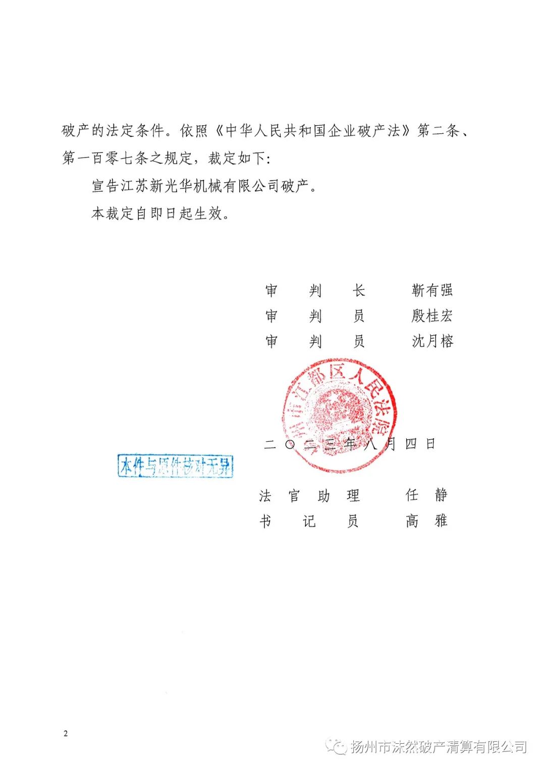 扬州市江都区人民法院裁定宣告江苏新光华机械有限公司破产