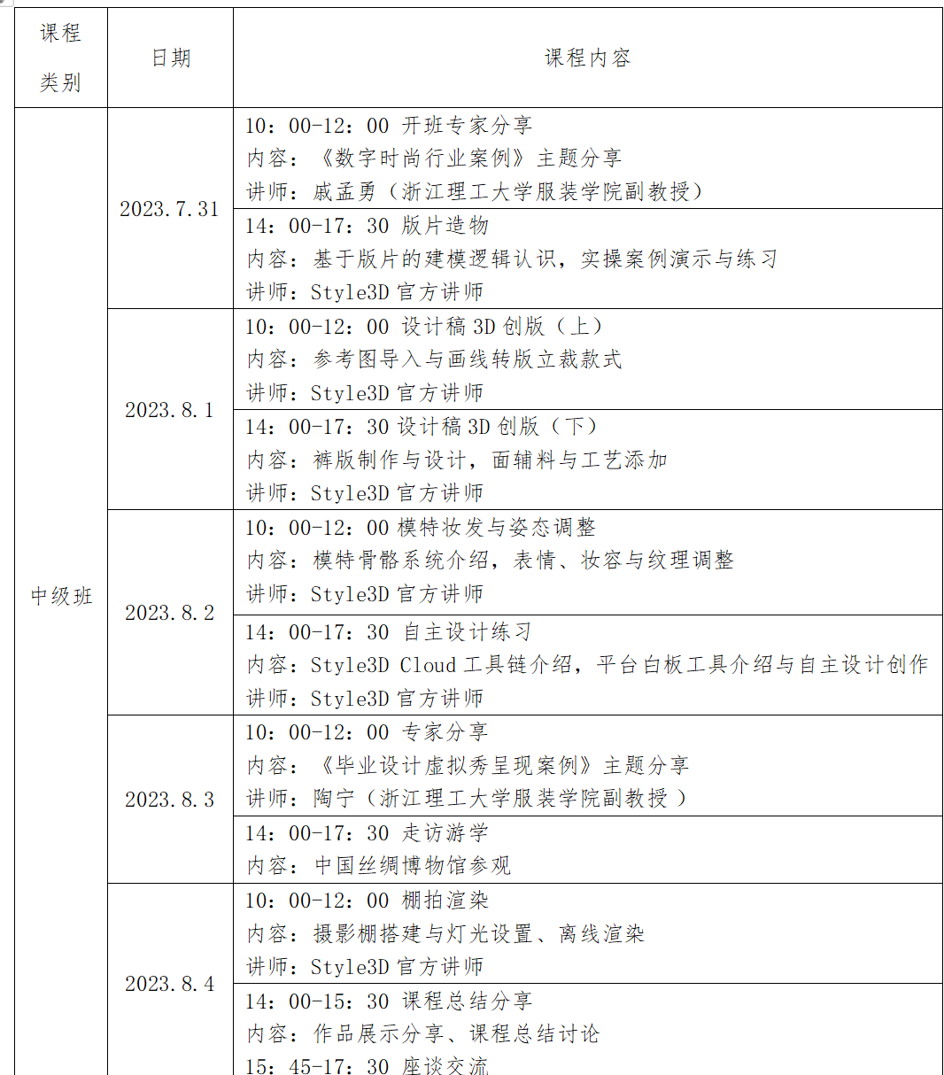 教师是立教之本、兴教之源。为了不断提高教师队伍的专业素养,建设一支师德修养高、业务素质精良、教学技能全面、教学基本功过硬、团队意识强、适应新时期学校发展需求的教师队伍,促进学校教育教学质量的不断提升,同时也为提升我院教师数字虚拟服装设计技能,保障未来服装数字设计生态发展,促进交流与协作,2023年7月31日,服装设计学院7名教师在贾金喜副主任的带队下赴浙江理工大学进行凌迪Style3D中级师资班培训。此次培训由凌迪数字科技有限公司主办。具体课程内容与相关安排如下: