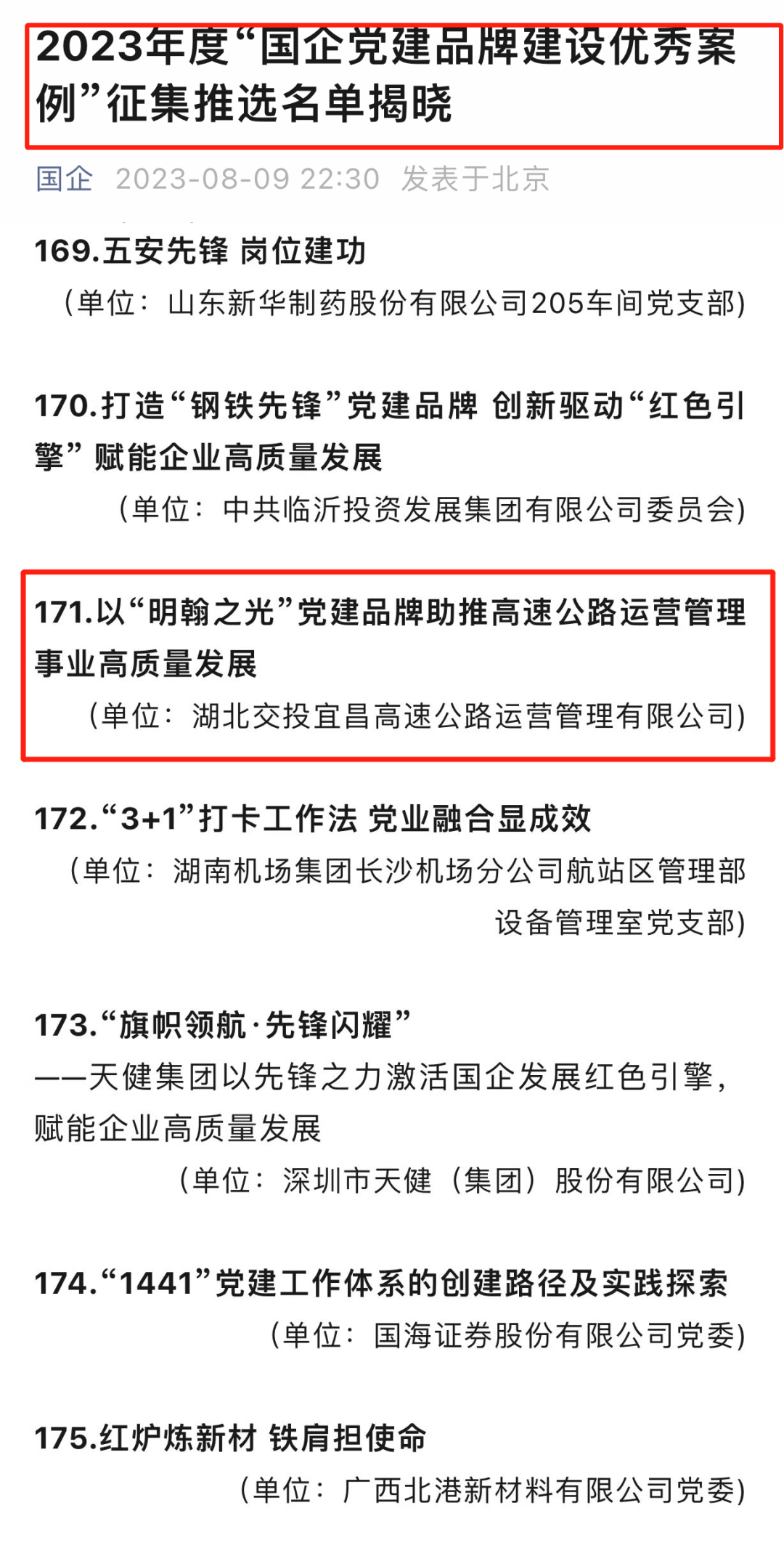 8月9日,由湖北交投宜昌高速公路运营管理有限公司报送的《以“明翰之光”党建品牌助推高速公路运营管理事业高质量发展》在《国企》杂志主办的2023年度“国企党建品牌建设优秀案例”征集推选活动中脱颖而出,成功入选“国企党建品牌建设优秀案例”。