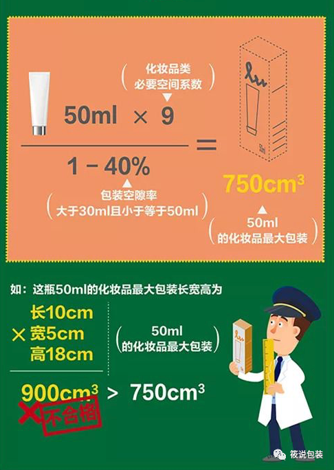 包装空隙率,即包装内去除内装物占有的必要空间容积与包装总容积的比率。GB 23350-2021中对包装空隙率的要求如下:Vn——商品销售包装体积,单位为立方毫米(mm3);13 ——新标准附录A中规定的酒类商品必要空间系数;30%——新标准中表1规定的净含量大于50mL的食品包装空隙率。如果我们购买了一瓶500mL的酒,测量其包装的长宽高之后,计算出包装的体积不超过9285.7cm3,则表明该商品没有过度包装。2022年6月15日,上海市市场监督管理局推出了全国首个“过度包装”便捷初判微信小程序——“包装有度”。通过该小程序,用户可以选择商品种类,输入商品净含量、包装的长宽高以及包装层数,初步判定商品的包装空隙率和包装层数是否涉嫌“过度包装”。在购买食品及化妆品类商品时,消费者如何快速判断是否存在过度包装呢?我们可以通过“一看、二问、三算”,就能简单判断出食品、化妆品等商品是否属于过度包装。一是看商品的外包装是否为豪华包装,包装材料是否属于昂贵的材质;二是新标准严格限定了包装层数要求,在不能拆开包装的情况下,要问包装有几层,层数是否符合要求;三是测量或估算外包装的体积,并与允许的最大外包装体积进行对比,看是否超标。合作请联系
