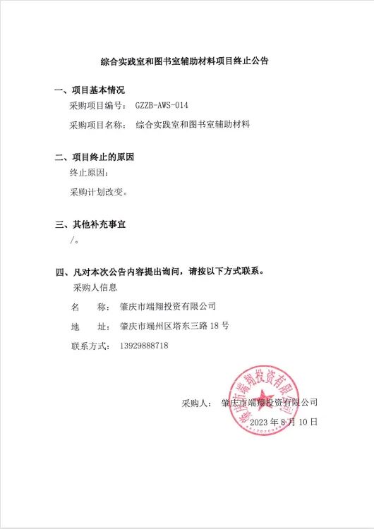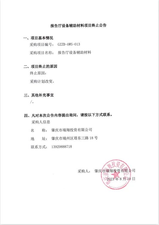 报告厅设备辅助材料项目终止公告