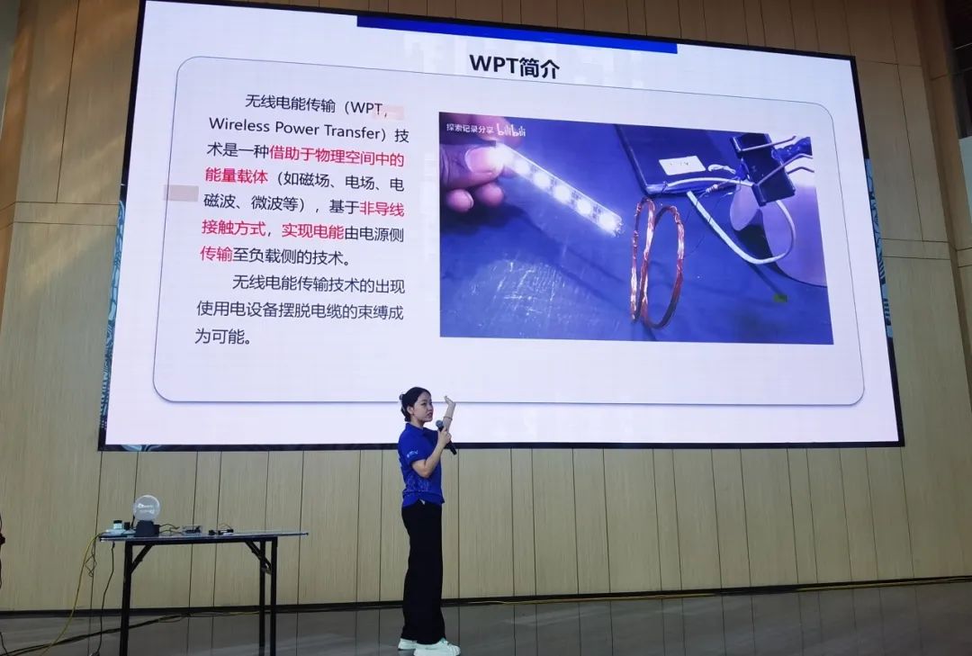 王雪越从无线电能传输在生活中的应用讲起,详细的介绍了电磁感应的原理,她以自身研究方向为背景,讲解了超声波在无线电能传输方面的应用。