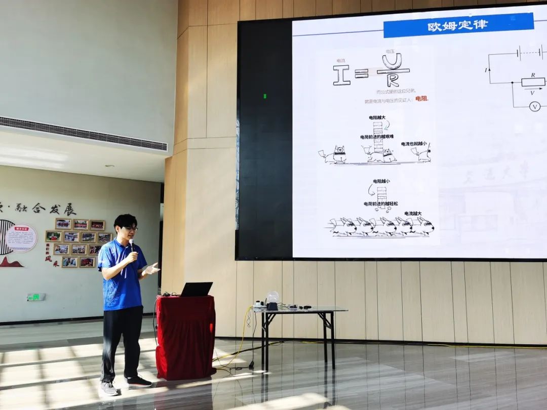 田文锐从人类对能源的需求、电力能源的特点以及高压输电三个方面展开分享。他用形象的语言介绍了欧姆定律和特高压输电之间的关系,详细讲述了特高压输电的发展历程及相关原理,引导大家进行思考和提问。