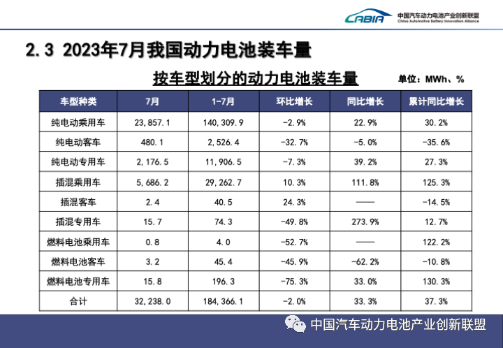 一、2023年7月纯电动乘用车装车量环比下降,其中配套磷酸铁锂的纯电动乘用车装车量环比下降6.7%,配套三元电池的纯电动乘用车装车量环比增长5.3%。