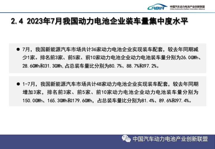 1-7月,我国新能源汽车市场共计48家动力电池企业实现装车配套,较去年同期增加3家,排名前3家、前5家、前10家动力电池企业动力电池装车量分别为150.0GWh、165.3GWh和179.6GWh,占总装车量比分别为81.4%、89.6%和97.4%。