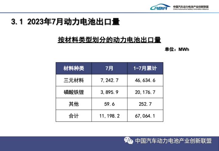 7月,我国动力电池企业电池出口共计11.2GWh。其中三元电池出口7.2GWh,占总出口64.7%;磷酸铁锂电池出口3.9GWh,占总出口34.8%。