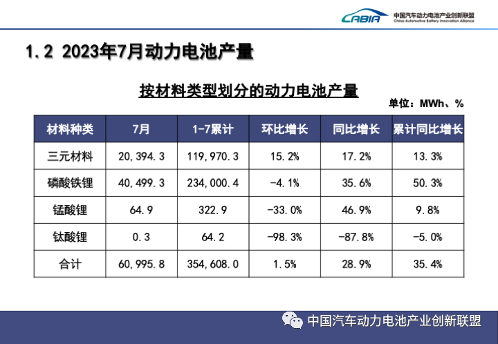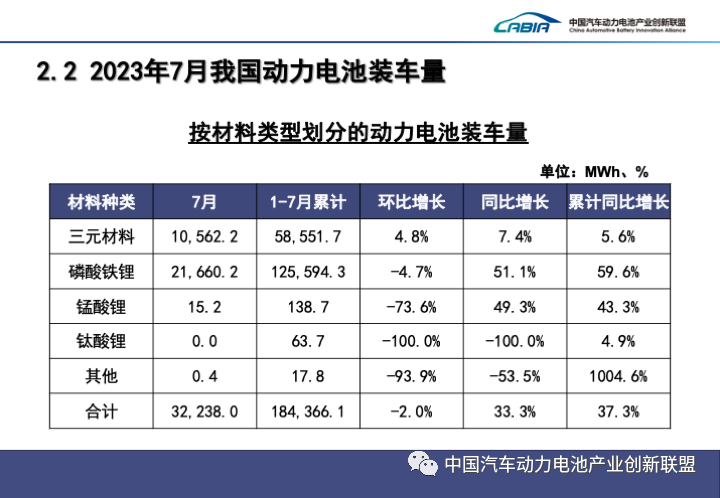 1-7月,我国动力电池累计装车量184.4GWh, 累计同比增长37.3%。其中三元电池累计装车量58.6GWh,占总装车量31.8%,累计同比增长5.6%;磷酸铁锂电池累计装车量125.6GWh,占总装车量68.1%,累计同比增长59.6%。