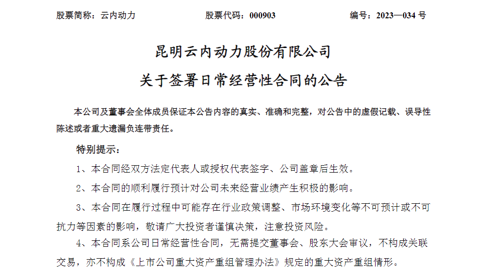 8月9日,昆明云内动力股份有限公司(以下简称“云内动力”,股票代码:000903)发布《关于签署日常经营性合同的公告》。