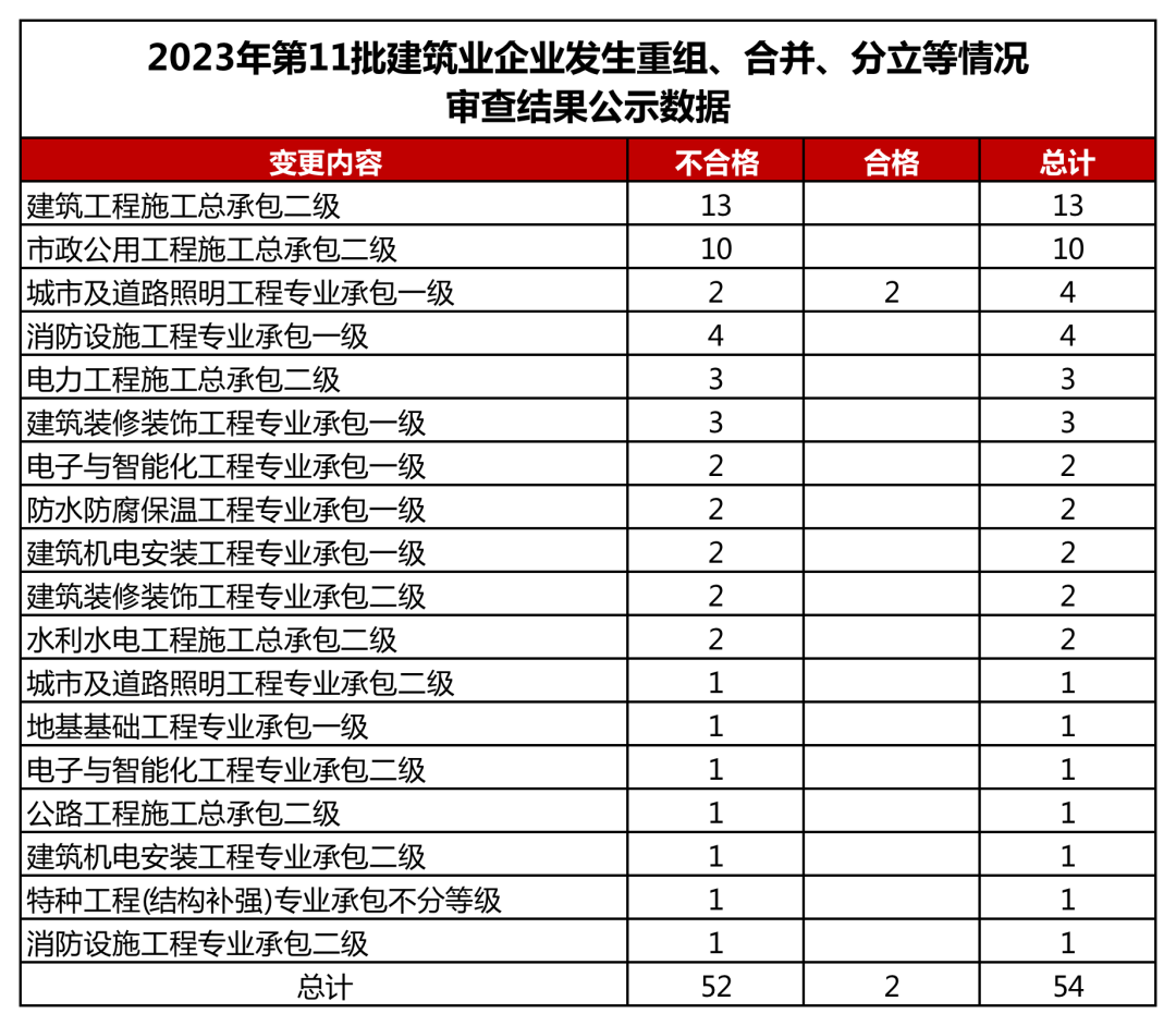 共54项资质重组合并分立,合格2项,不合格52项。