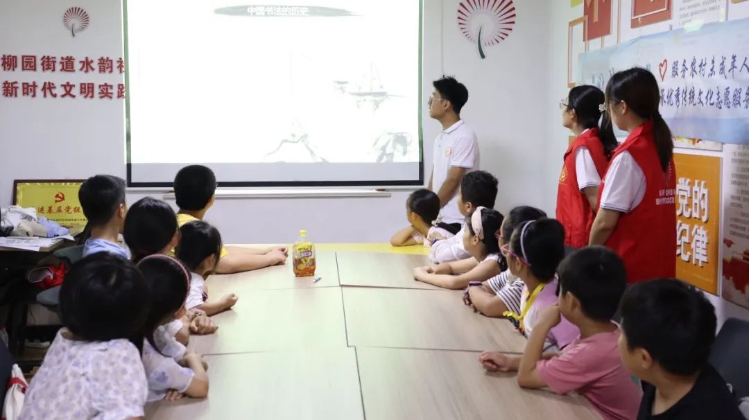 活动伊始,志愿者从书法的起源、形成、种类、书写技巧等方面向孩子们讲解,并从初学者的角度出发,结合书写过程中需要注意的事项,依次为孩子们介绍了笔墨纸砚的选择和正确的执笔方式,让孩子们更深一步地了解书法文化的博大精深,学习书法的益处。