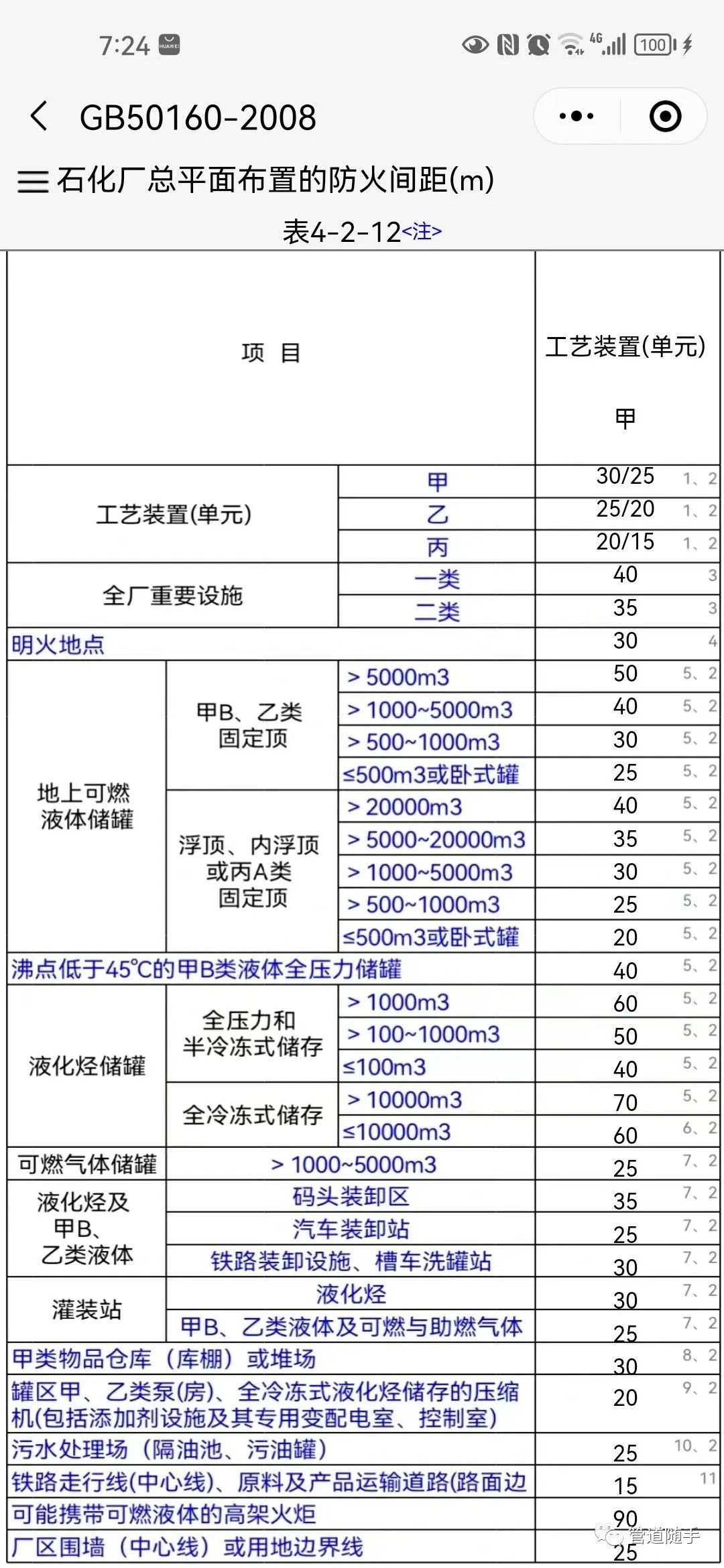 6.单罐容积等于或小于1000m3,防火间距可减少25%(火炬除外);大于50000m3,应增加25%(火炬除外);