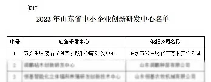 近日,山东省轻工集体企业联社公示2023年山东省中小企业创新研发中心名单,潍坊泰兴生物化工有限责任公司液晶光阻有机颜料创新研发中心被认定山东省中小企业创新研发中心。