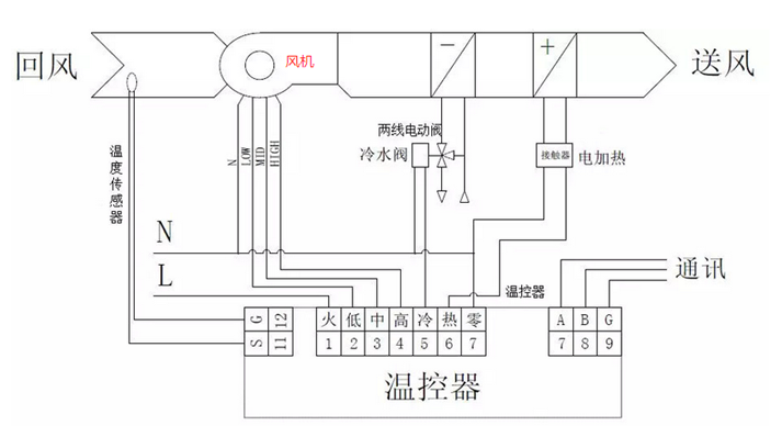 (3)温度控制:温控器根据设定温度与实际检测温度的比较、运算,自动控制STV系列电动两/三通阀的开闭;风机的三速转换。或直接控制风机的三速转换与启停,从而通过控制系统风量达到恒温的目的。