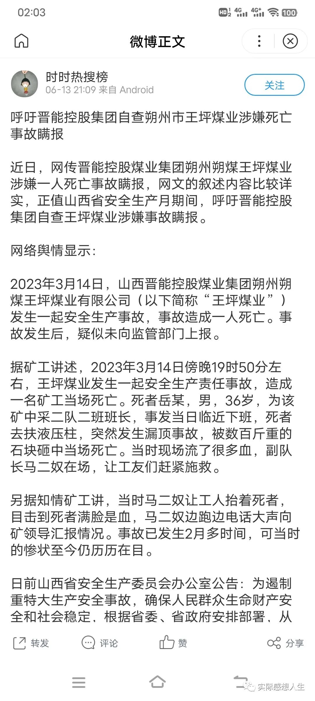 近日,网传晋能控股煤业集团朔州朔煤王坪煤业涉嫌一人死亡事故瞒报,网文的叙述内容比较详实,正值山西省安全生产月期间,呼吁晋能控股集团自查王坪煤业涉嫌事故瞒报的爆料出现在各大网络社交平台,引起网民的广泛关注。一直未见涉事企业和朔州市,怀仁县监督监管权威部门做出任何正面回应,按照常理如果爆料内容有误,应该有个正面回应才对,否则应视为内容属实。关于这个爆料内容真实吗?查处结果如何?对于网帖的真实性,有关部门也不能等闲视之。